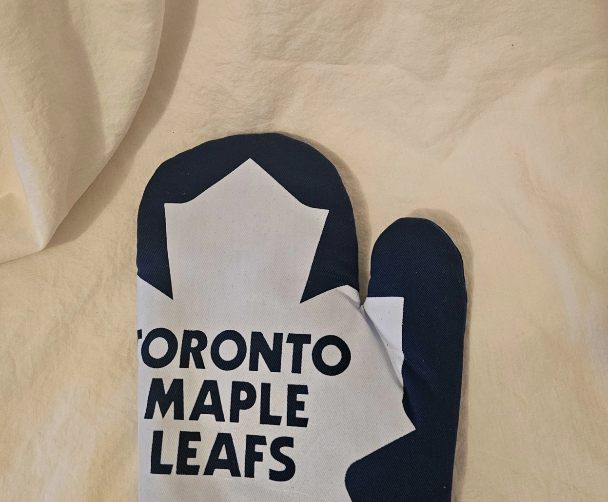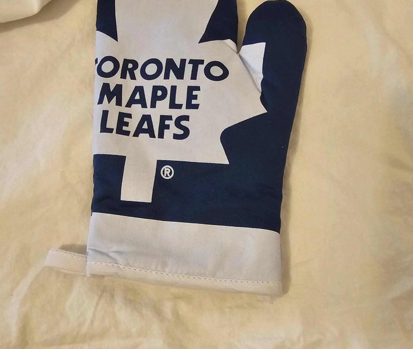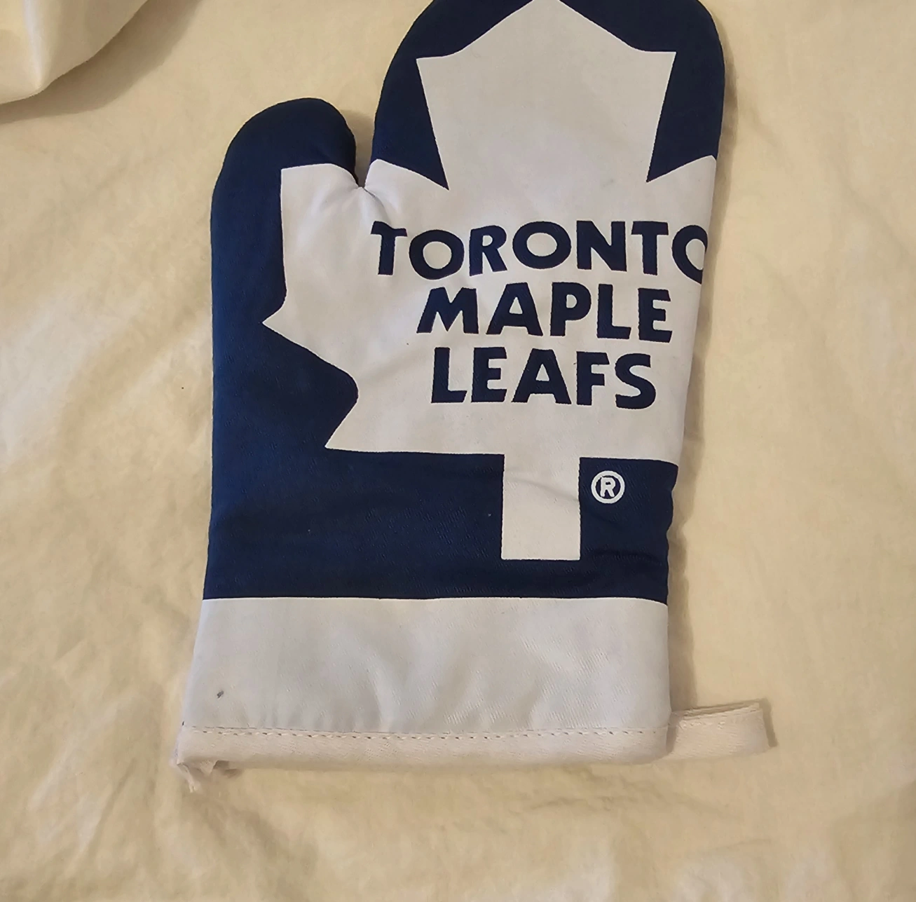 This Blue and White Toronto Maple Leafs Oven Mitt has 2 blue stains from manufacturing but otherwise it is Brand New and never used. 80% Cotton 20% Polyester Measurements: Length: 6 1/2 inches. Width: 3/4 inches. Height: 10 1/2 inches. From a smoke free home. Cash and E-Transfer accepted. Pick up only.