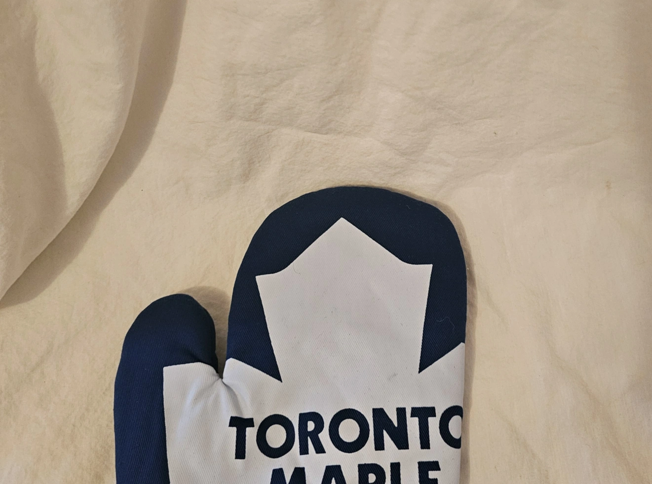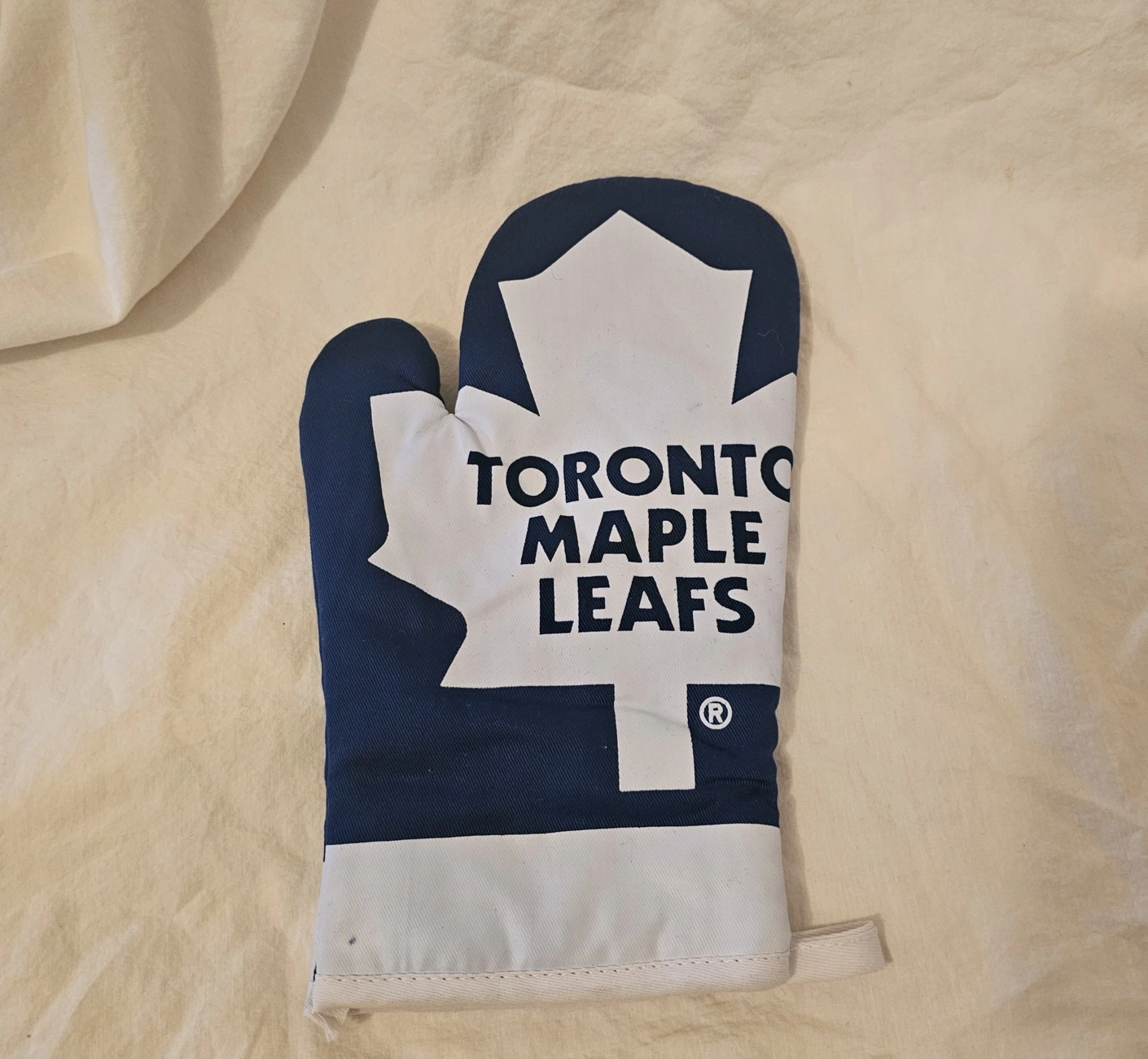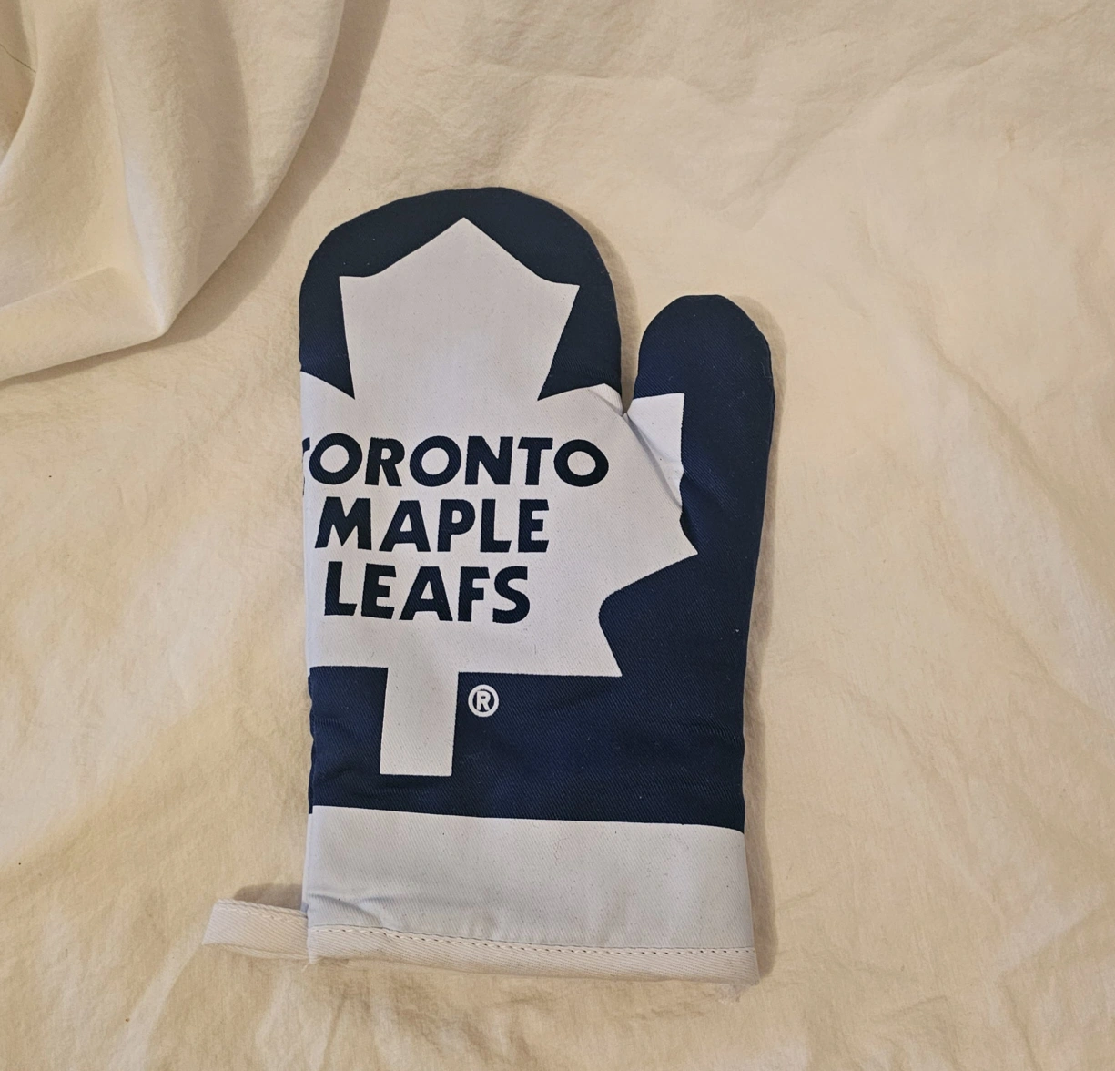 This Blue and White Toronto Maple Leafs Oven Mitt has 2 blue stains from manufacturing but otherwise it is Brand New and never used. 80% Cotton 20% Polyester Measurements: Length: 6 1/2 inches. Width: 3/4 inches. Height: 10 1/2 inches. From a smoke free home. Cash and E-Transfer accepted. Pick up only.