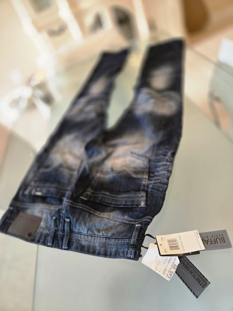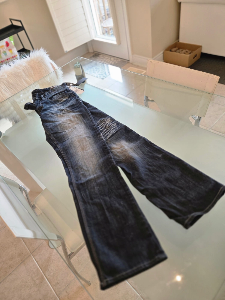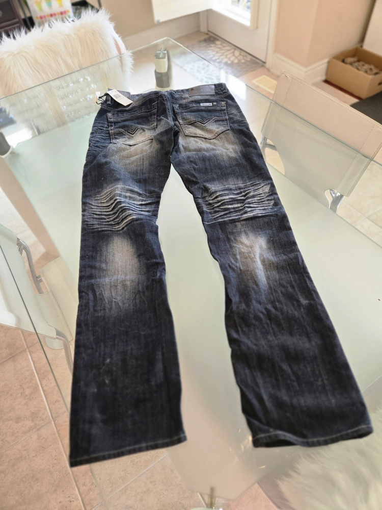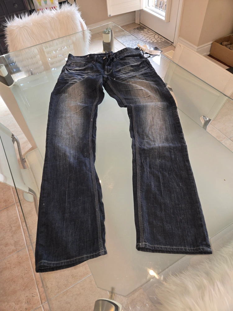 Dark wash jeans with a bootcut fit. They have some distressing details. Brand new with tags on