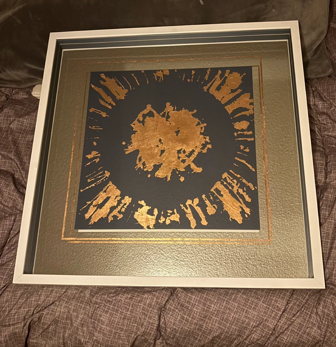 Framed abstract art with gold accents. Frame is 80 cm x 80 cm and 1 1/2” deep. Navy and copper abstract art.