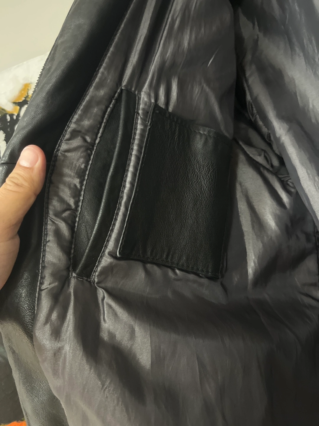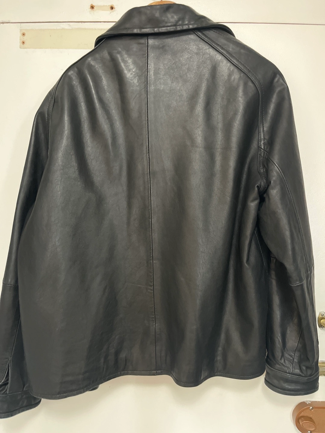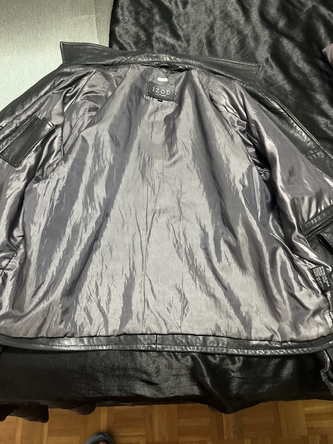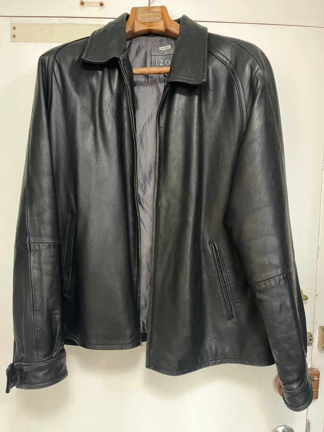 Black leather jacket with zipper closure, two front pockets and 2 inside pockets one with zipper. Jacket zipper needs to be replaced which will cost you about 15 dollars Beautiful, soft like butter leather, no rips/tares, scratches. Lining in perfect condition. Cost 400 new. Size XL You can pick up by Carlton and Jarvis area
