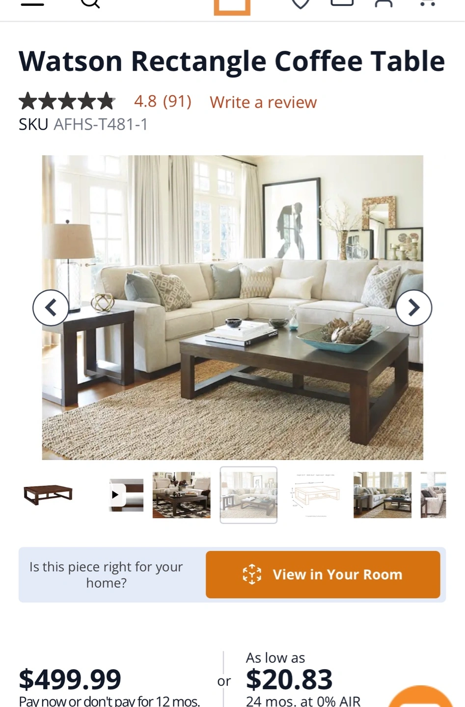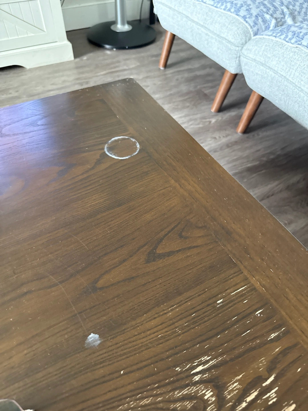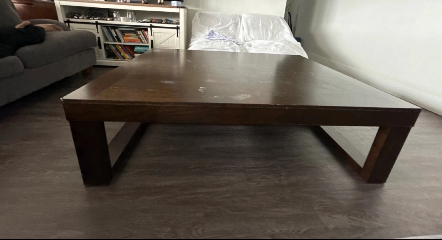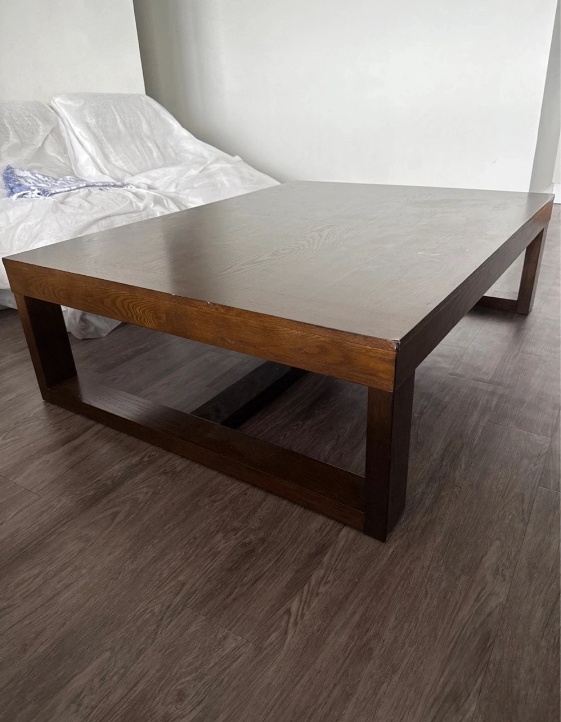 Large, square coffee table with a dark wood finish. Some wear and tear on the top. Table is sturdy and well-built. Perfect for a living room or family room. Original new table is 500 in Ashley Move out sale need to go asap. The offers accepted