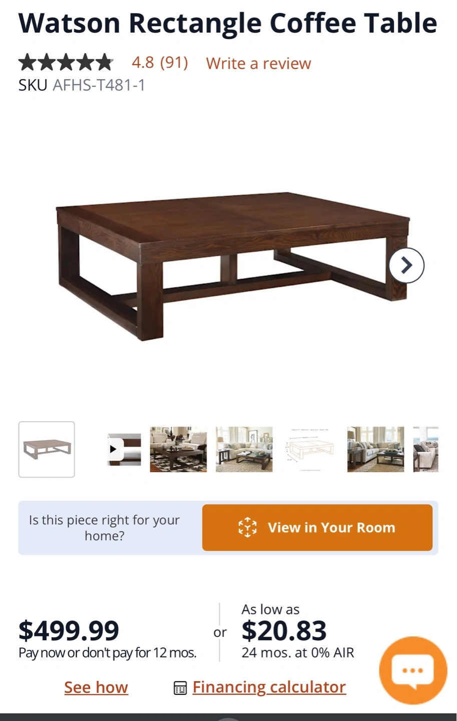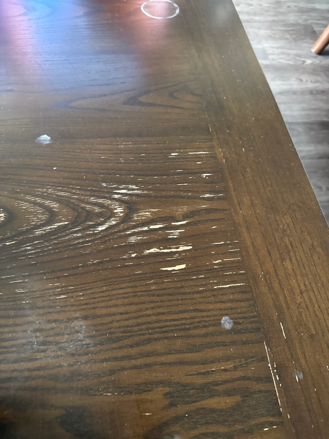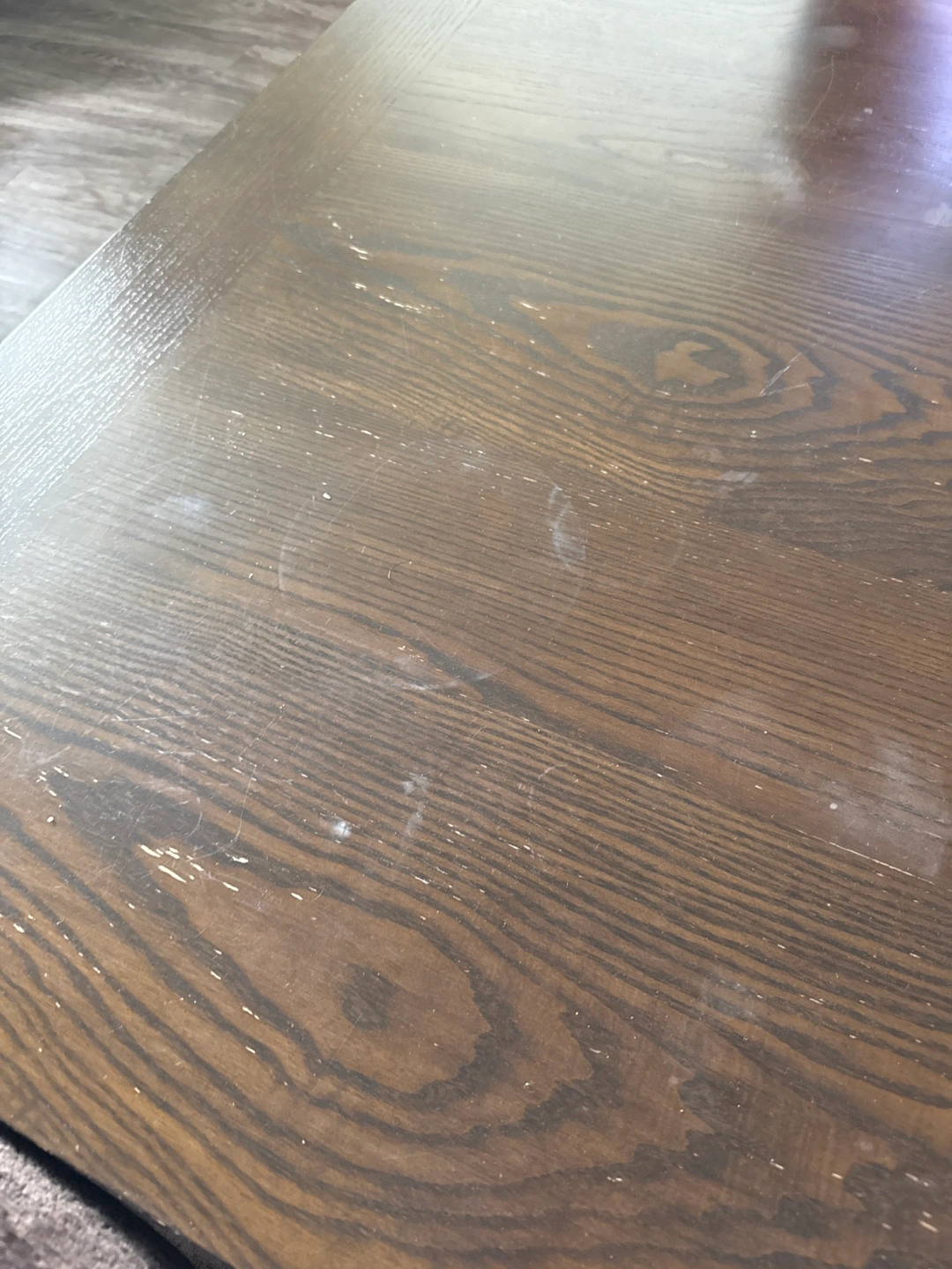 Large, square coffee table with a dark wood finish. Some wear and tear on the top. Table is sturdy and well-built. Perfect for a living room or family room. Original new table is 500 in Ashley Move out sale need to go asap. The offers accepted