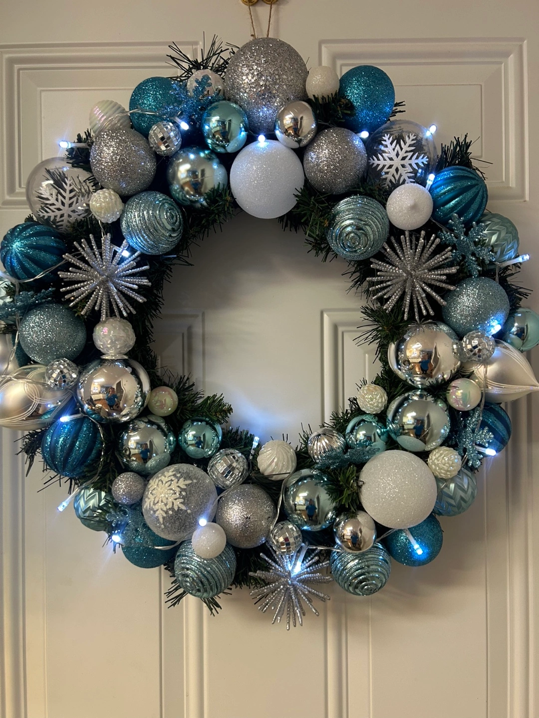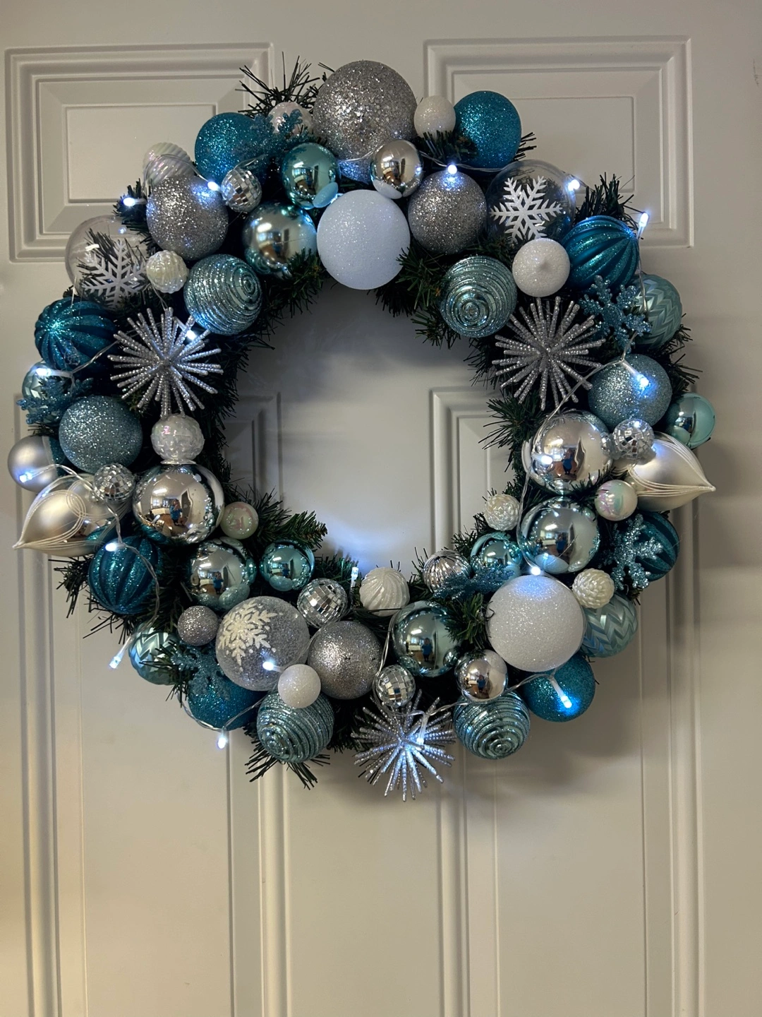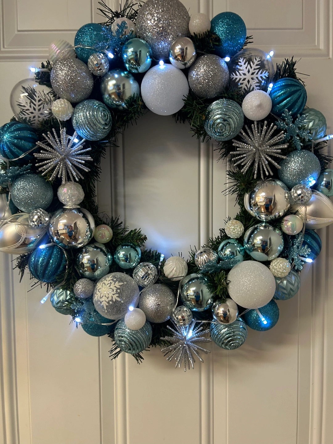 Beautiful blue and silver Christmas wreath with mini lights ( batteries included) Brand new Handmade Smoke Free home Pickup in Horseshoe Valley