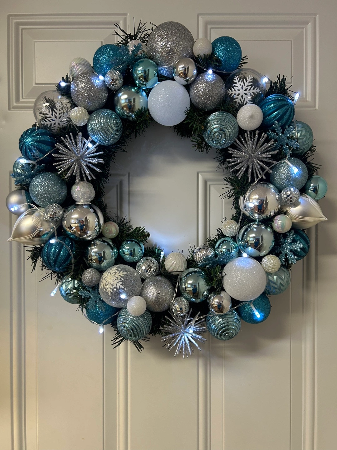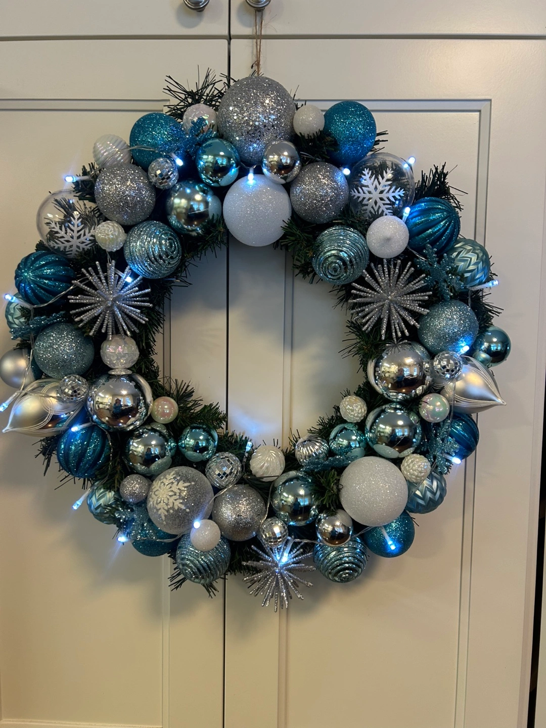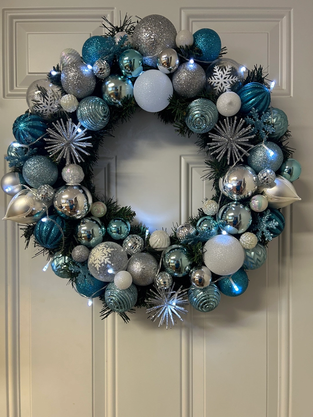 Beautiful blue and silver Christmas wreath with mini lights ( batteries included) Brand new Handmade Smoke Free home Pickup in Horseshoe Valley