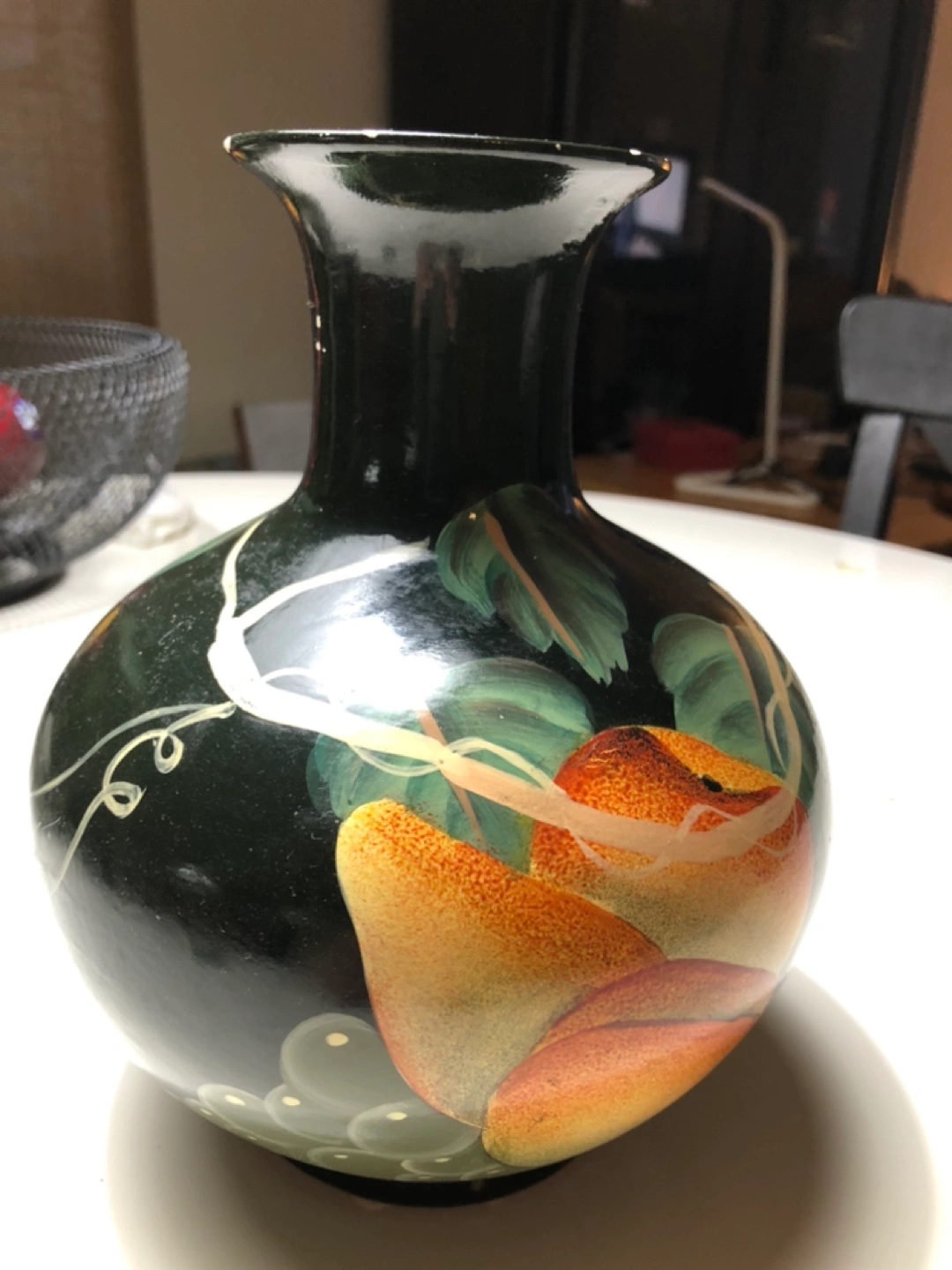 Black vase with hand-painted fruit design. The design features grapes and a pear. Minor pain chips on the rim