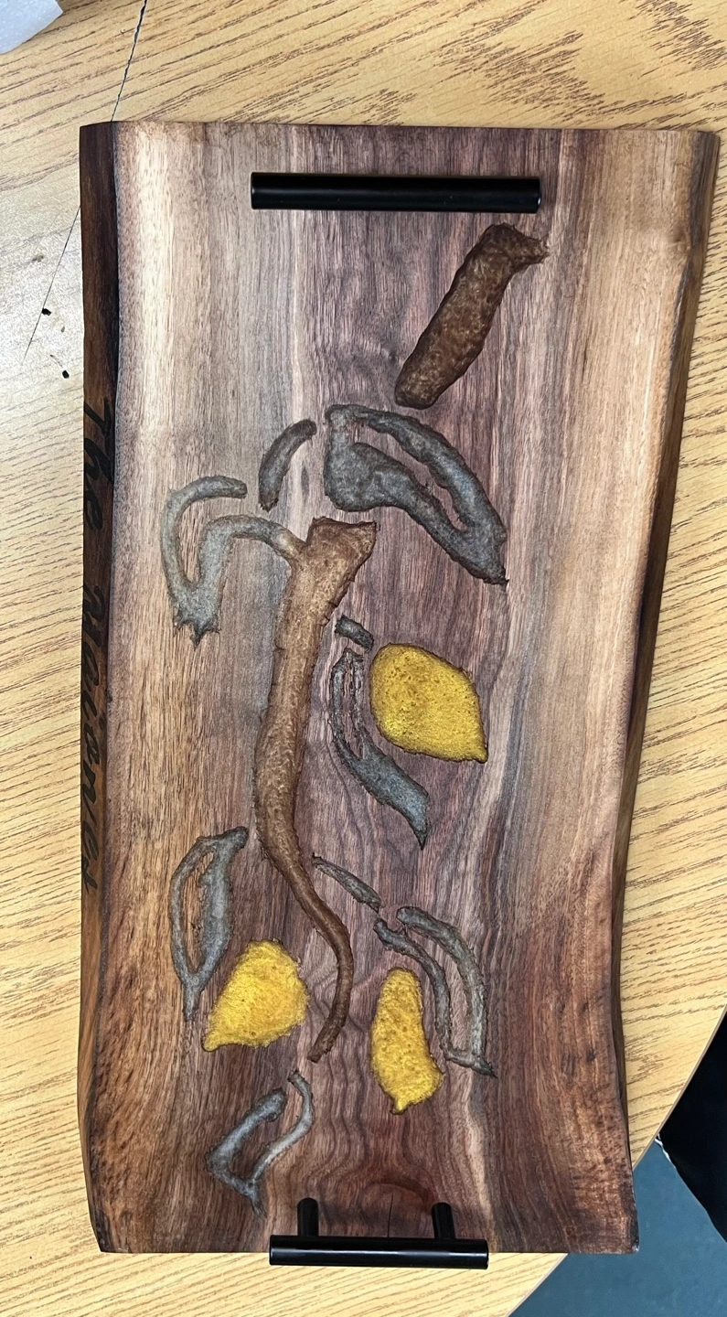 Wooden serving tray with black metal handles and epoxy resin inlay. Unique design and great for serving.