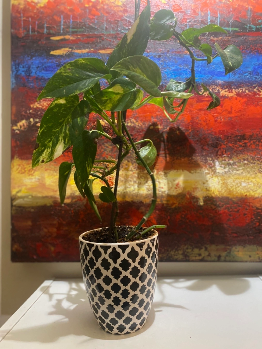Potted plant with green leaves and white variegation. Pot is black and white with a geometric pattern.