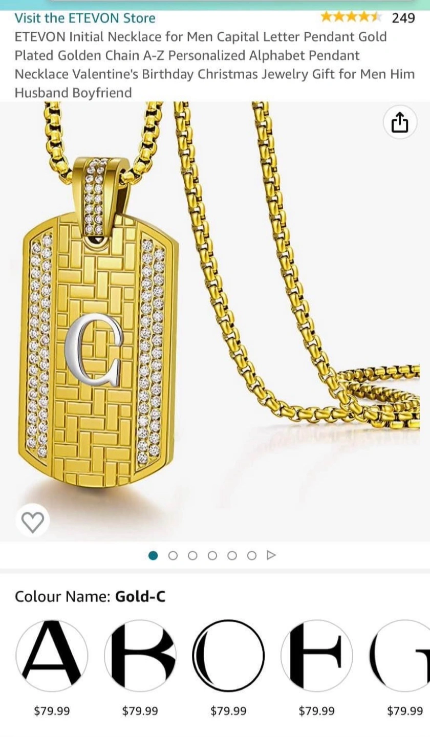 Gold-plated chain necklace with a letter C pendant, encrusted with rhinestones. Comes with a blue velvet box.