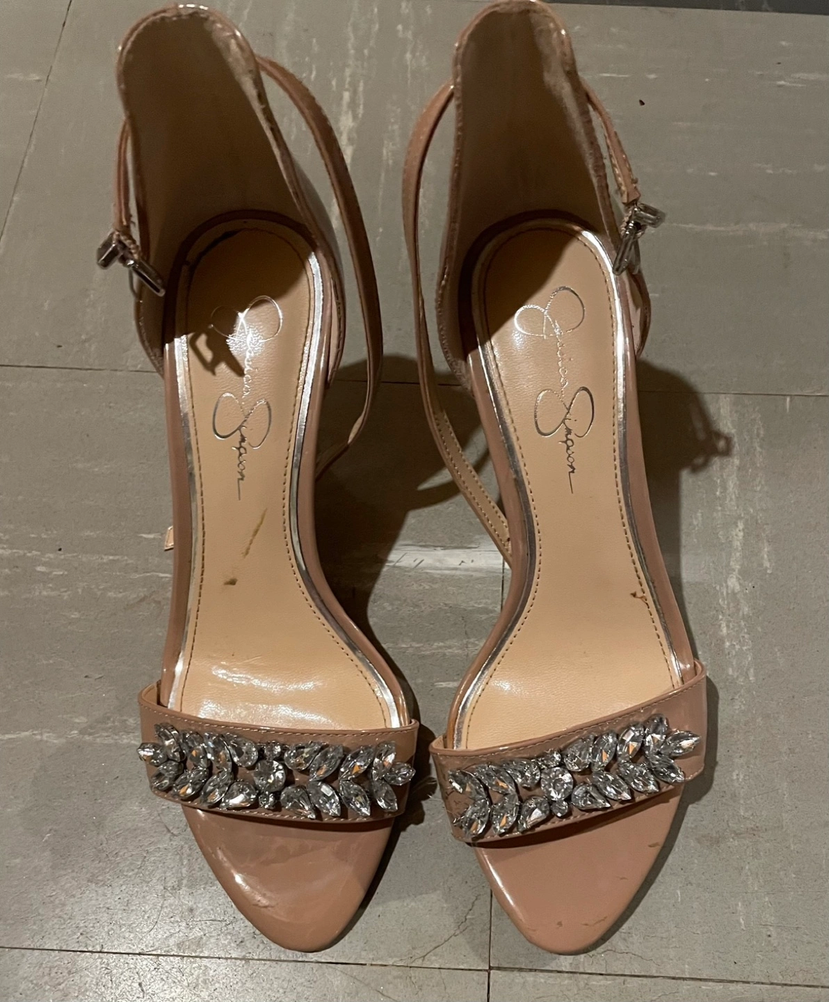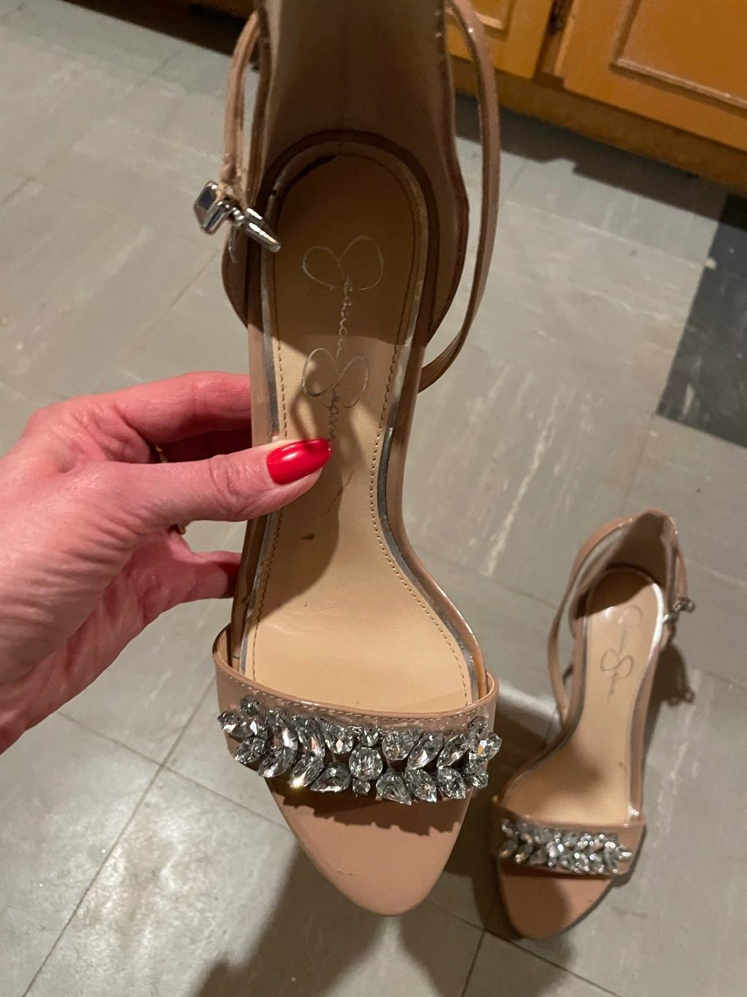 Nude heeled sandals with rhinestone detail. Adjustable ankle strap. Size 8