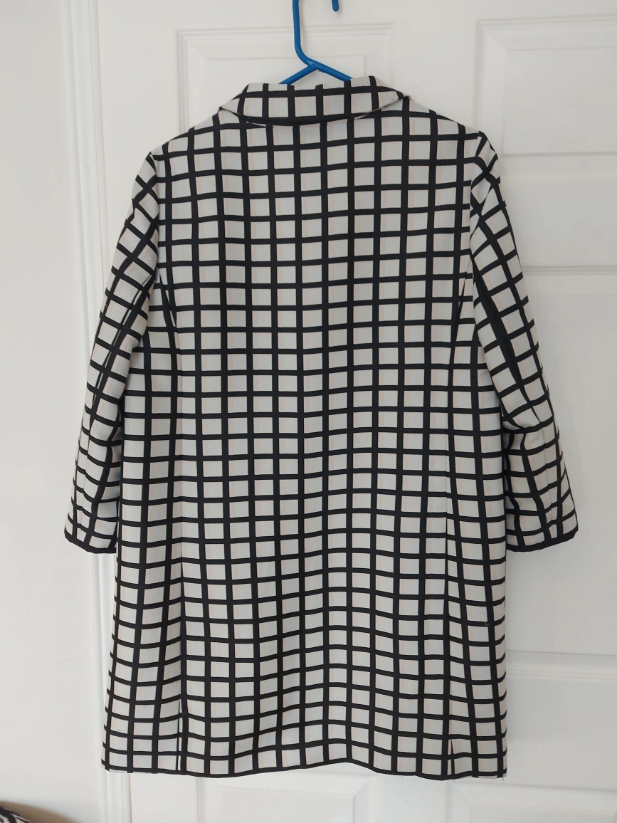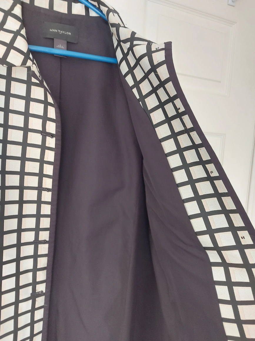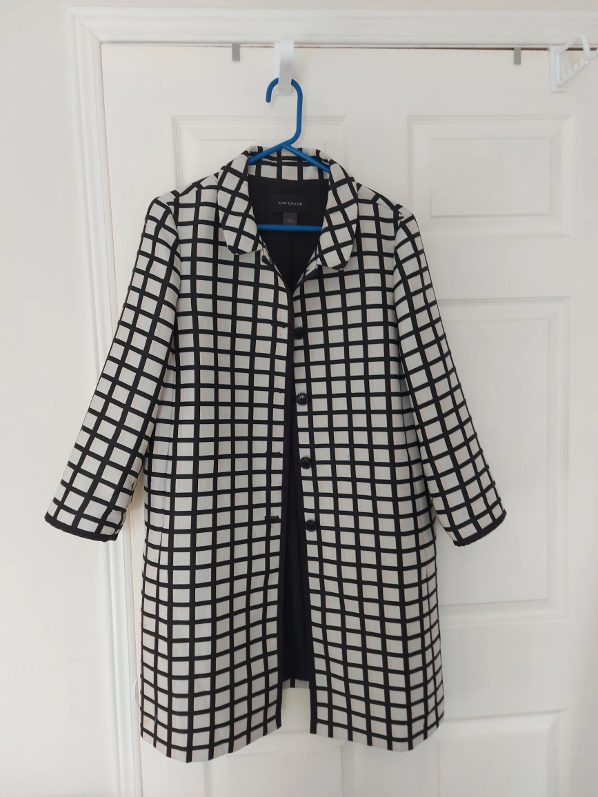 Ann Taylor Lightweight topper coat. Black, white and cream windowpane. 5 button closure. Size large. pick up at Gerrard and Greenwood