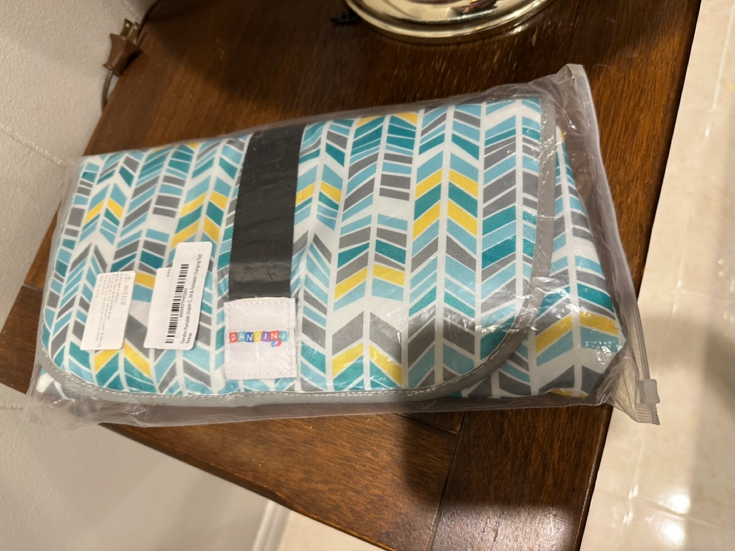 New, unused diaper changing pad. Chevron pattern in blue, grey, and yellow.
