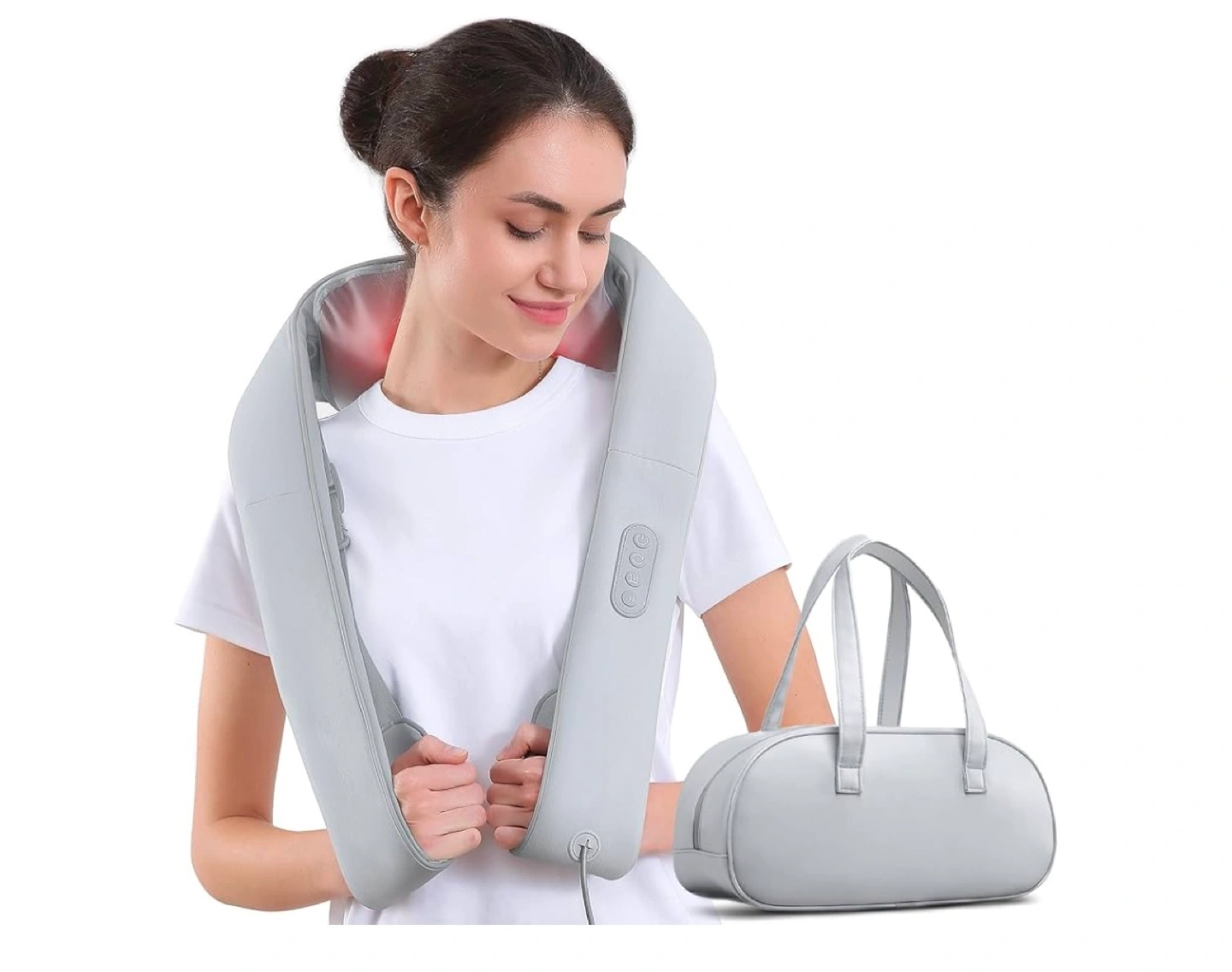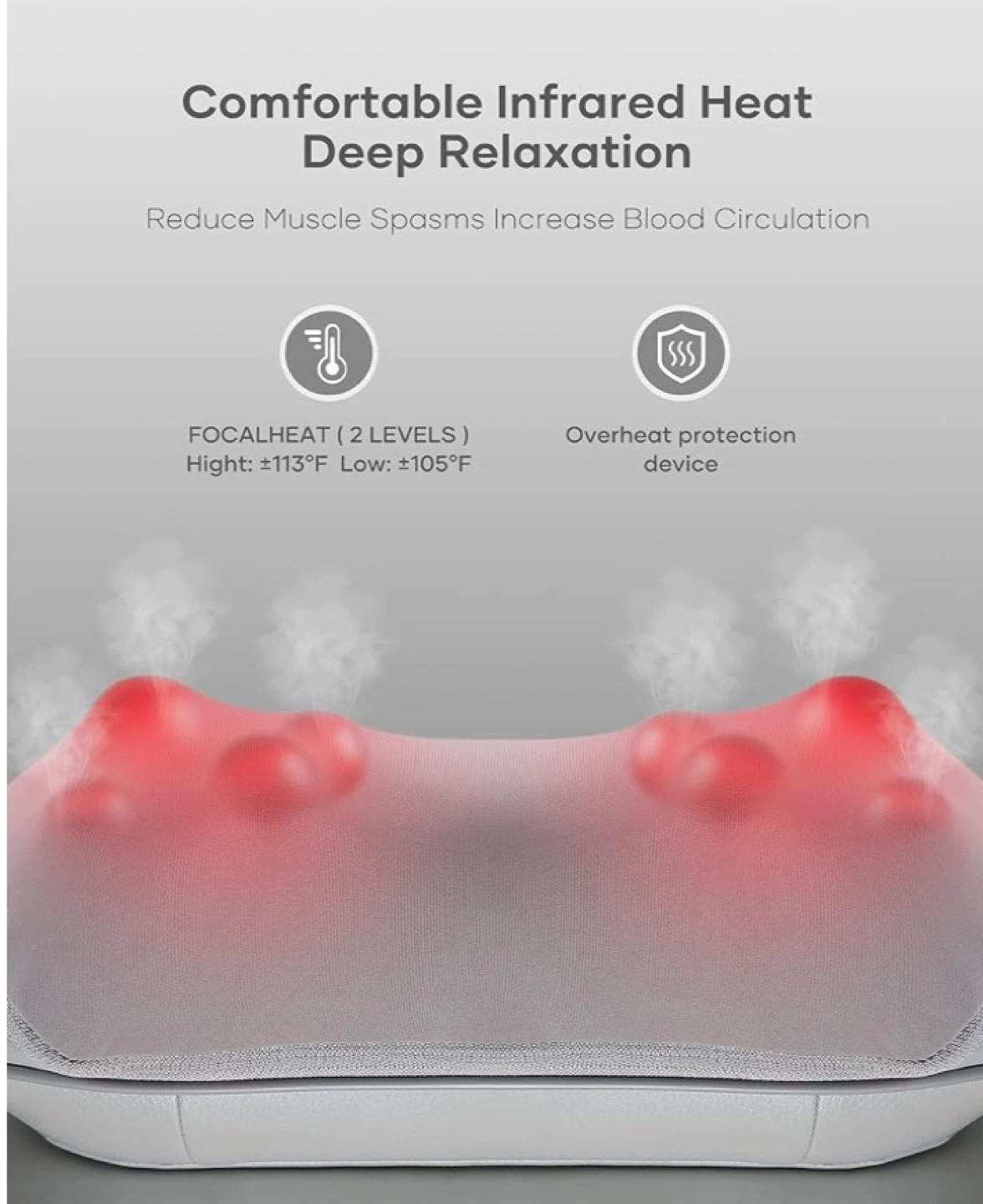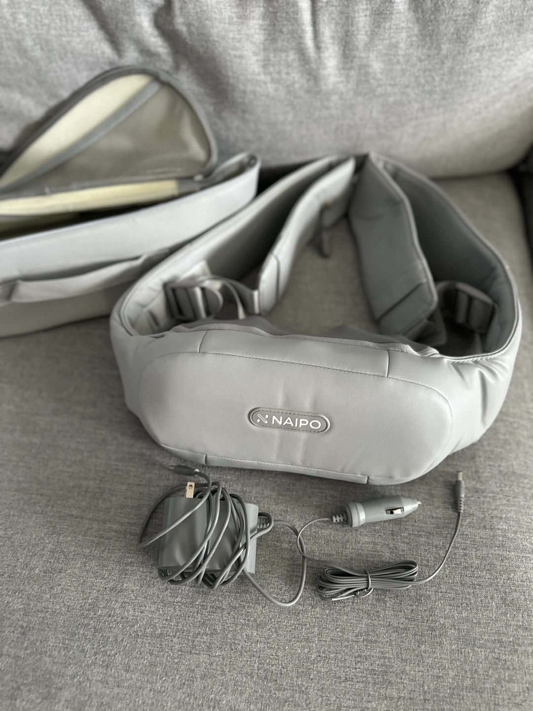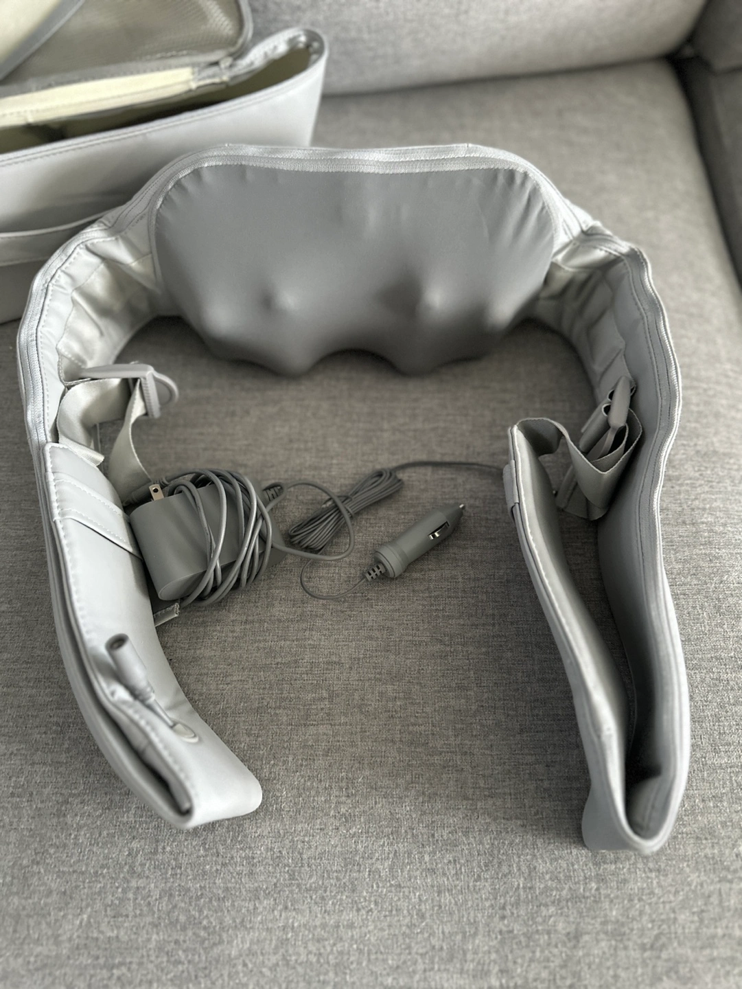 Like new with carrying bag. Deeper Kneading Massage: deep-shiatsu kneading massage nodes rotate bi-directionally with 3 optional speeds to replicate an in-person massage experience. 3D rotation kneading massage rollers perfect to use on the neck, shoulders, upper back, lower back, waist, foot, tights, calves, legs, feet, and arms. Also has a heat feature Unique Adjustable Straps: Our neck and shoulder massager has adjustable arm straps that range in overall length from 48 cm to 58 cm to create just the right fit for different body types. The shoulder massager can be shared usage among family and friends. Comfortable Material and Washable: Our body massager is washable for long-term hygiene. Bring less friction with soft, breathable fabric. Premium PU leather can be kept clean with a simple wipe. The sleek gray color makes a modern look and feel. Portable Back Massager: Our back and neck massager come with a sleek carrying bag. Easy to carry and easy to operate. Use it anytime, anywhere. This massager comes with a home power adapter and a car charger so that you can use it in the office, car, or at home.