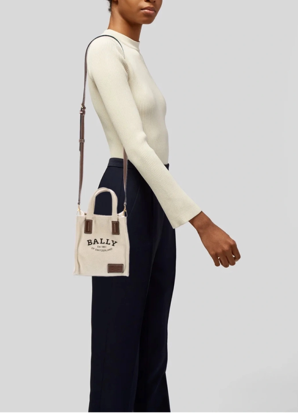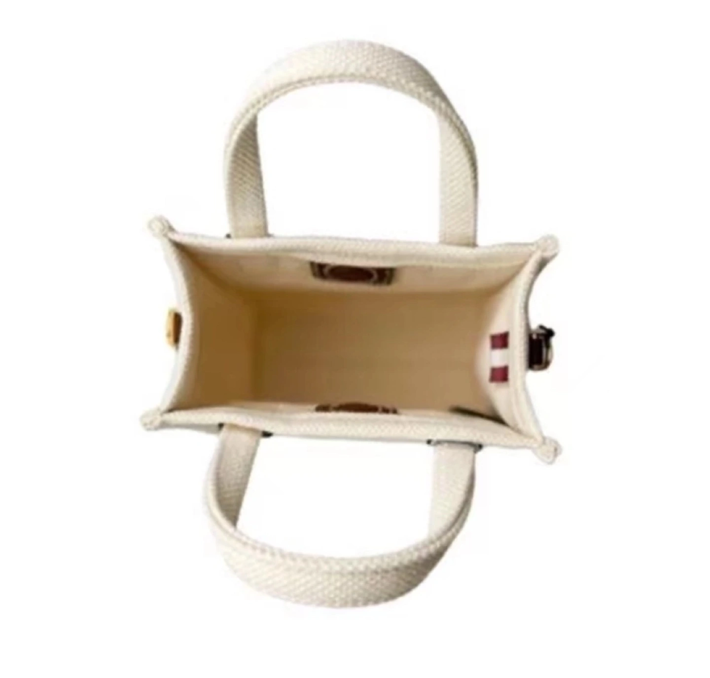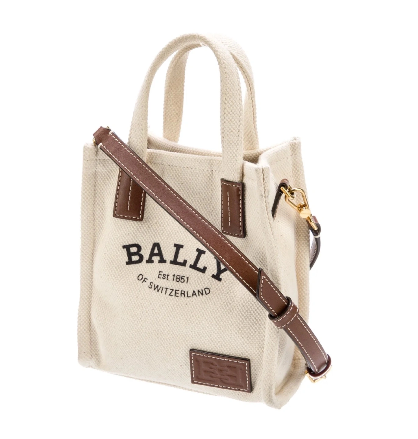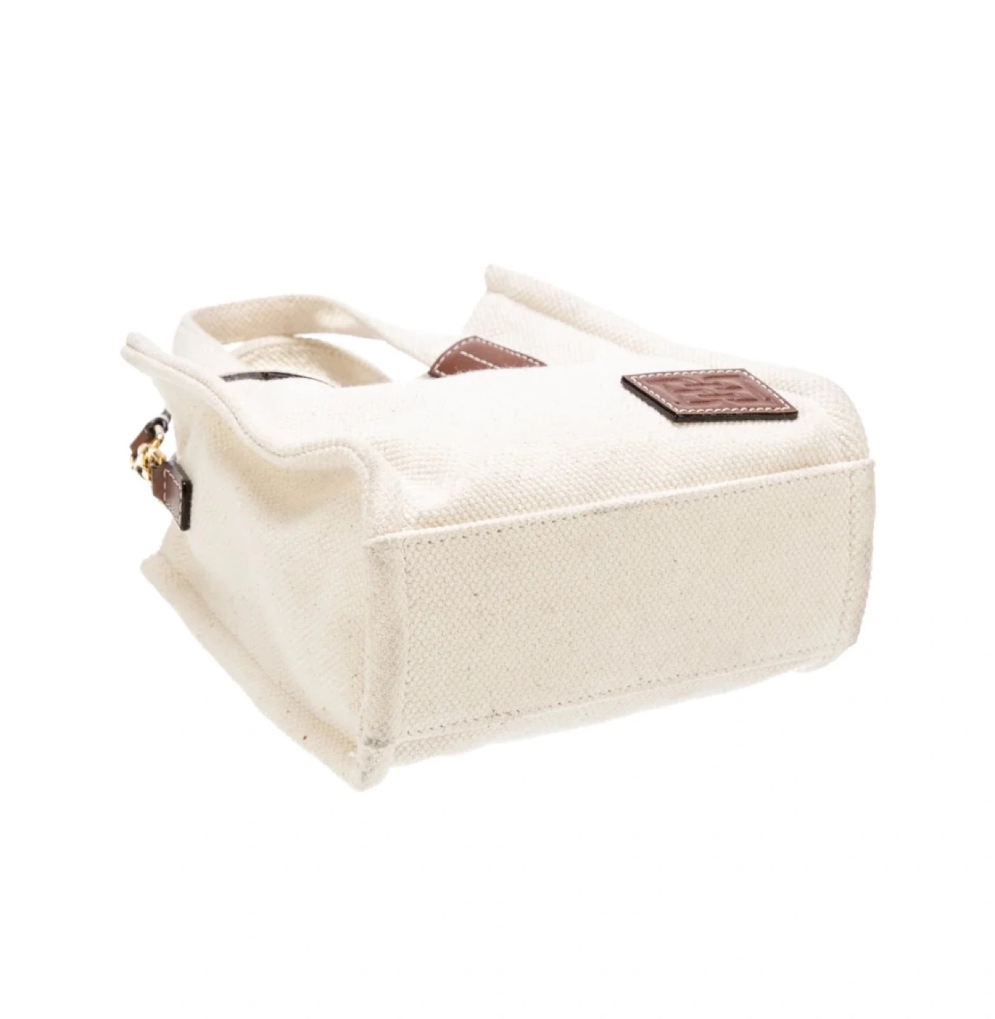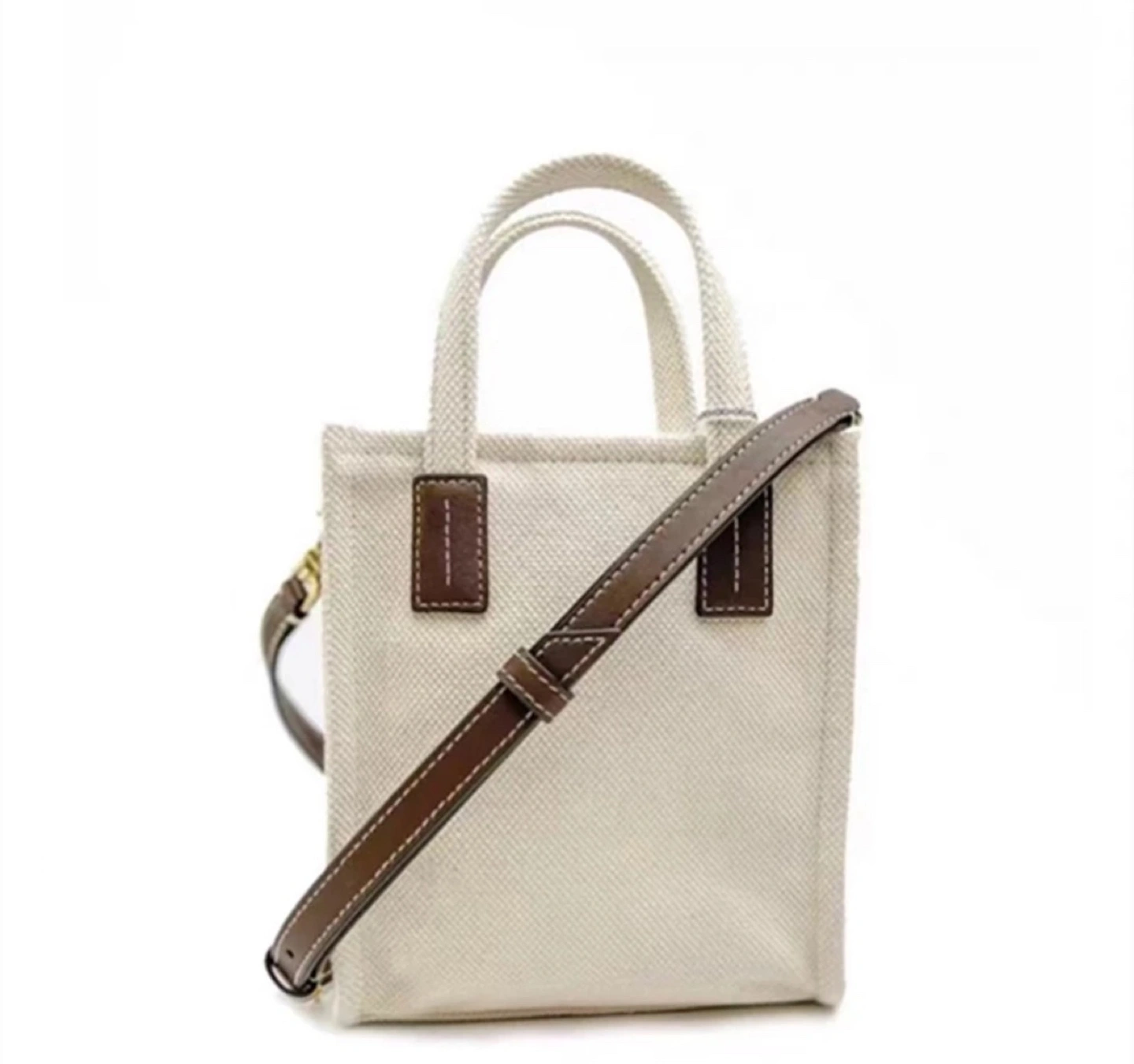 White canvas tote bag with brown leather accents and adjustable strap. Super sale already!