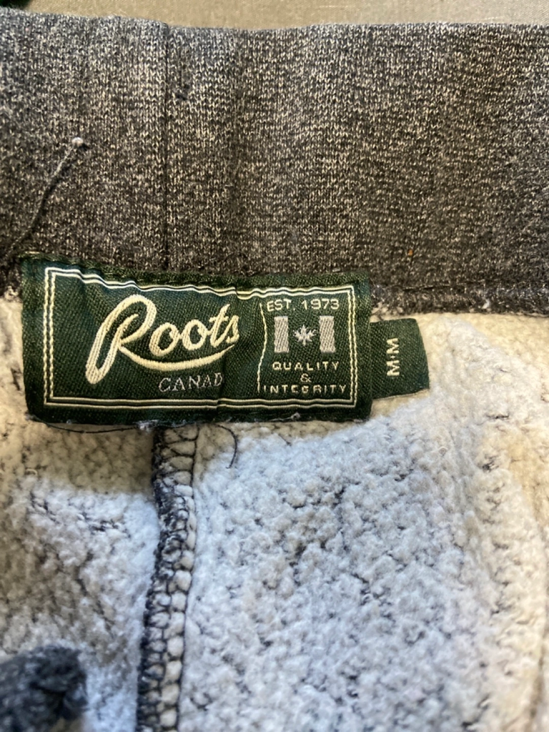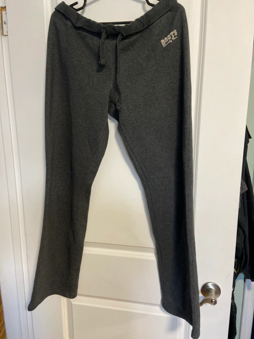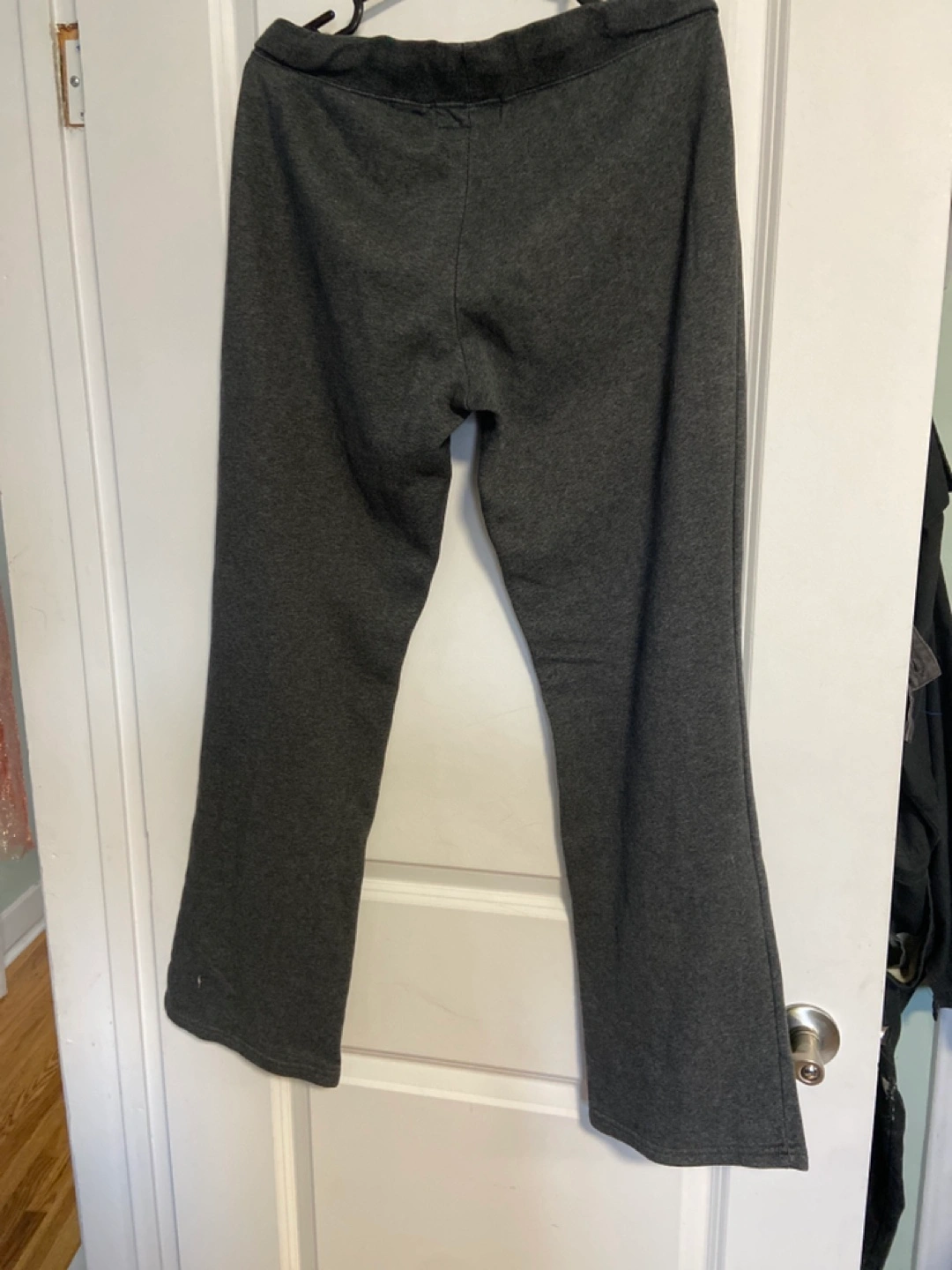 Grey sweatpants with a drawstring waist.