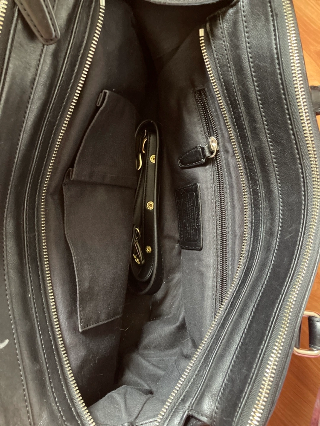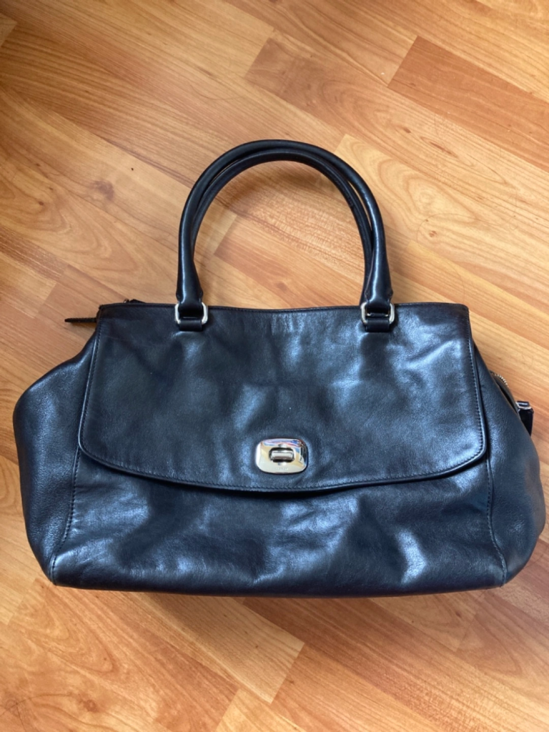 Black leather handbag with two handles, a zipper closure, and a detachable shoulder strap. It has multiple interior pockets. Coach Pinnacle Harper Satchel (23562) Material: Glove-tanned cowhide leather Retail Price (originally): USD $498 / CAD ~$650 Dimensions: Approx. 15” (L) x 10” (H) x 6” (W) Features: Turnlock flap, top zip, dual handles, optional shoulder strap