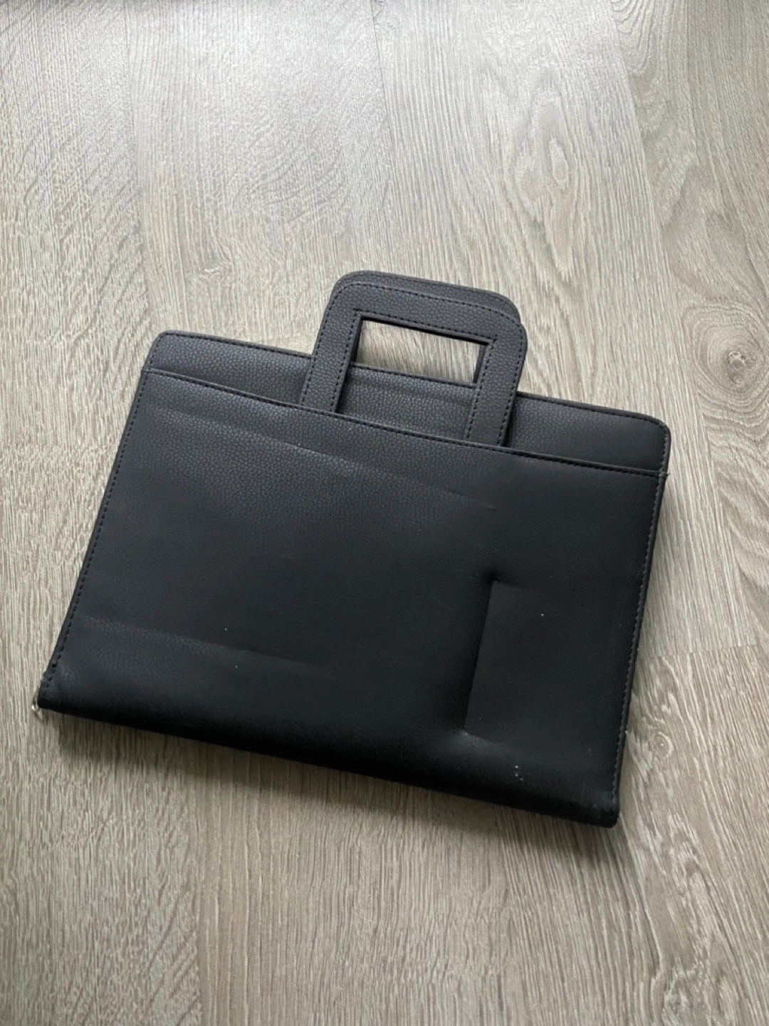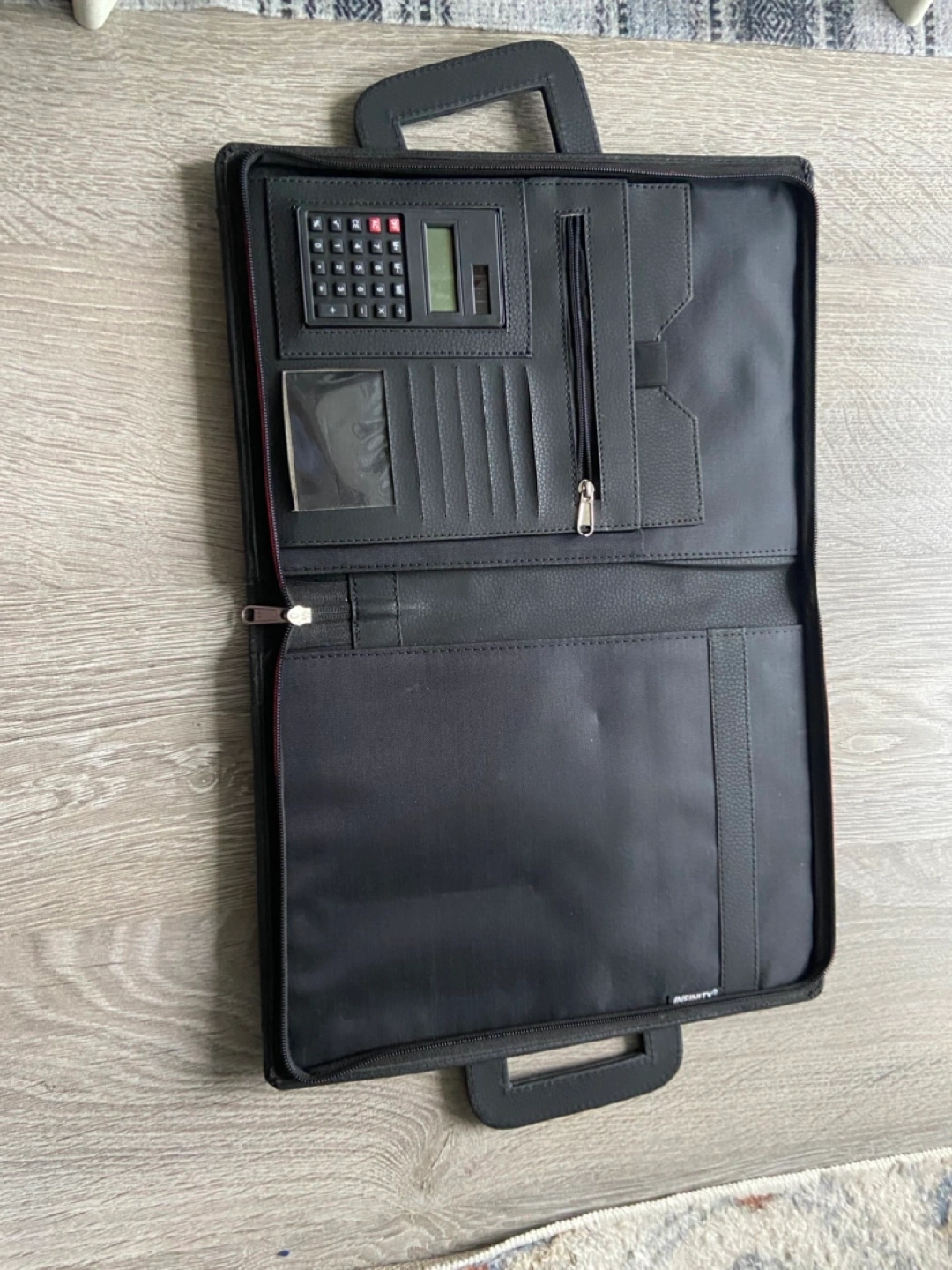 Black leather portfolio/briefcase. Features a calculator, zipper closure and a built-in handle. Excellent for organizing documents and everyday use. Has some folds/wrinkles due to storage, never used