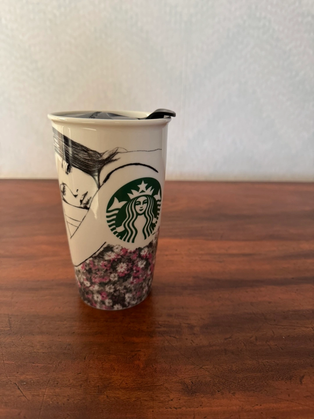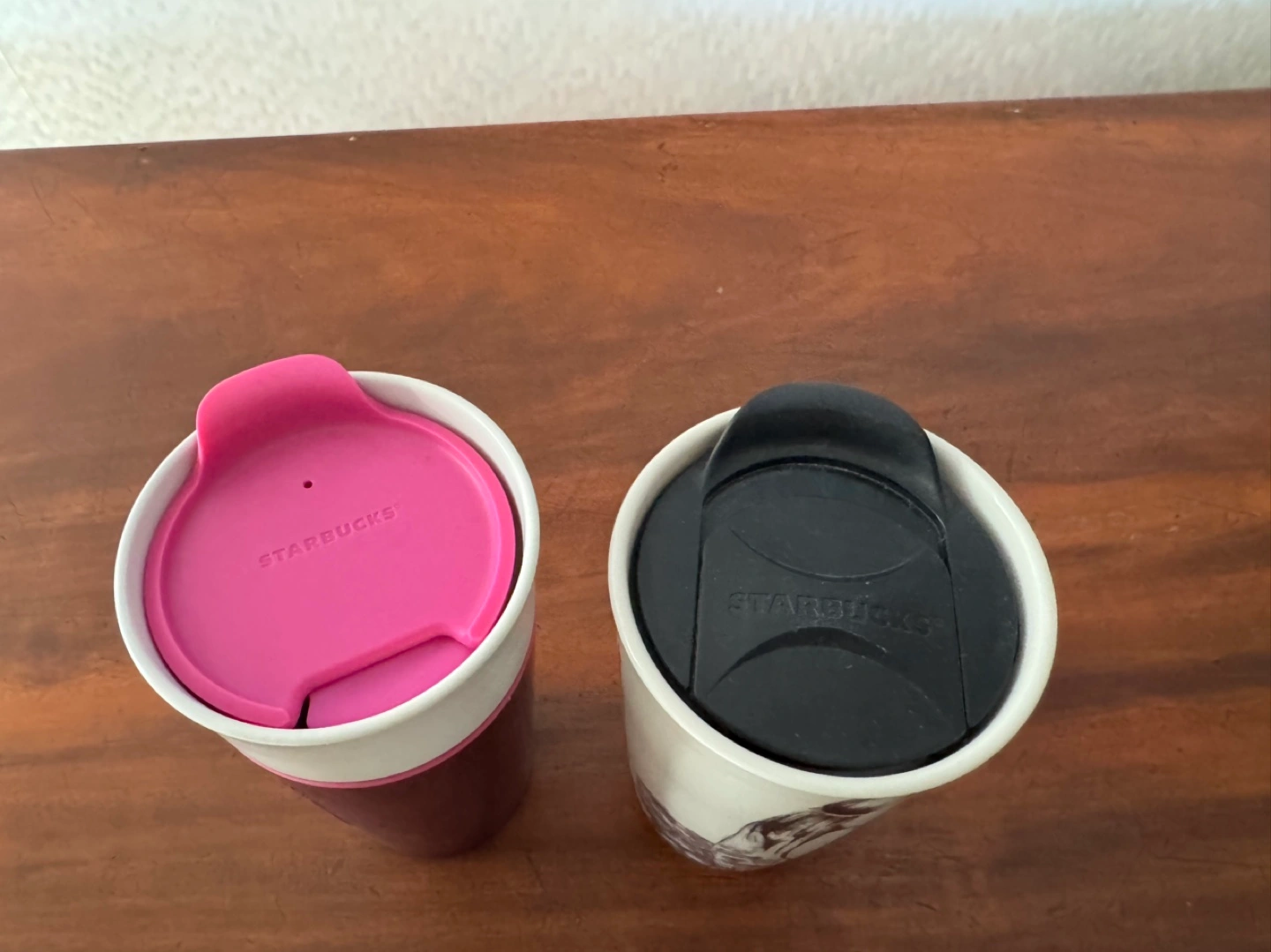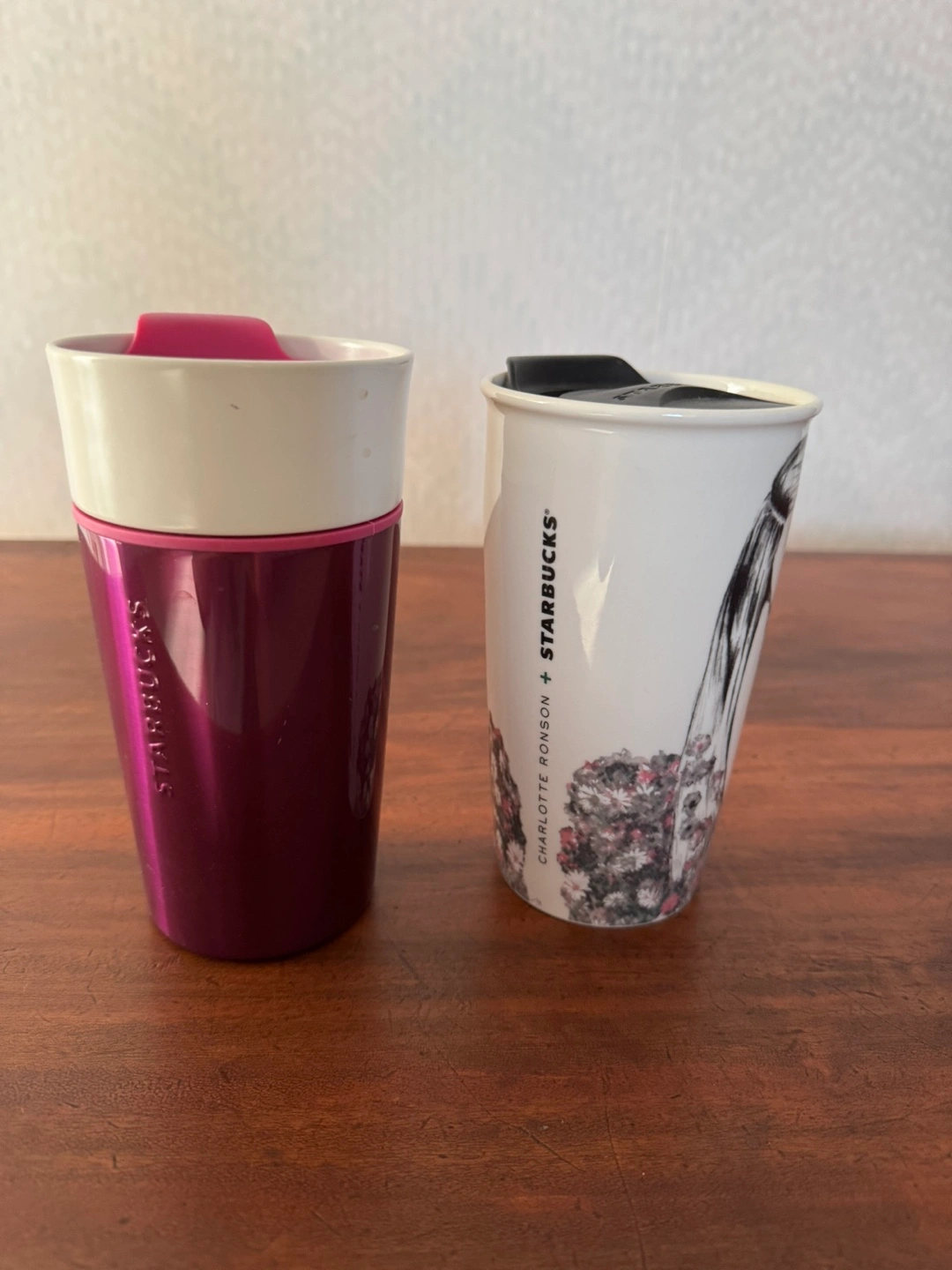 Two Starbucks tumblers, one with a purple exterior and a pink lid, and the other with a floral design and black lid. Both include lids.