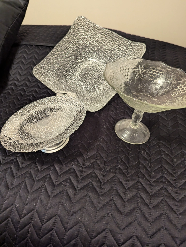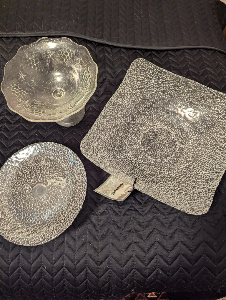 Three piece glassware set, includes a cake platter, large dish and pedestal dish. Cake platter is about 8.5 inches in diameter. All in clear glass.