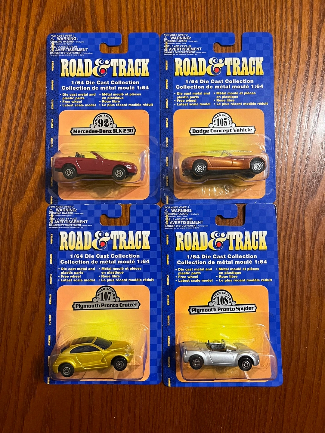 BNIP Vintage Maisto Road & Track Limited Edition 1:64 Scale diecast. $6 each. Mercedes-Benz SLK 230 #92. Dodge Concept #105. Plymouth Pronto Cruizer #107. Plymouth Pronto Spyder #108. Information is shown in the pictures. Cross posted.