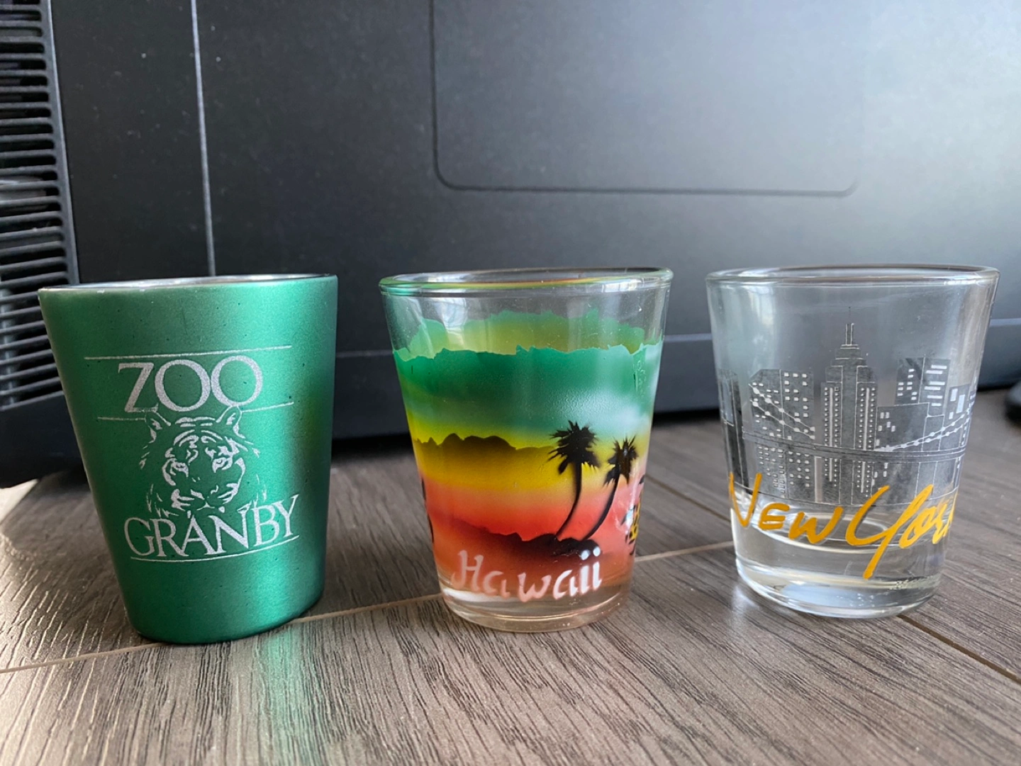 Set of 3 shot glasses, featuring a tiger, palm trees, and a cityscape.