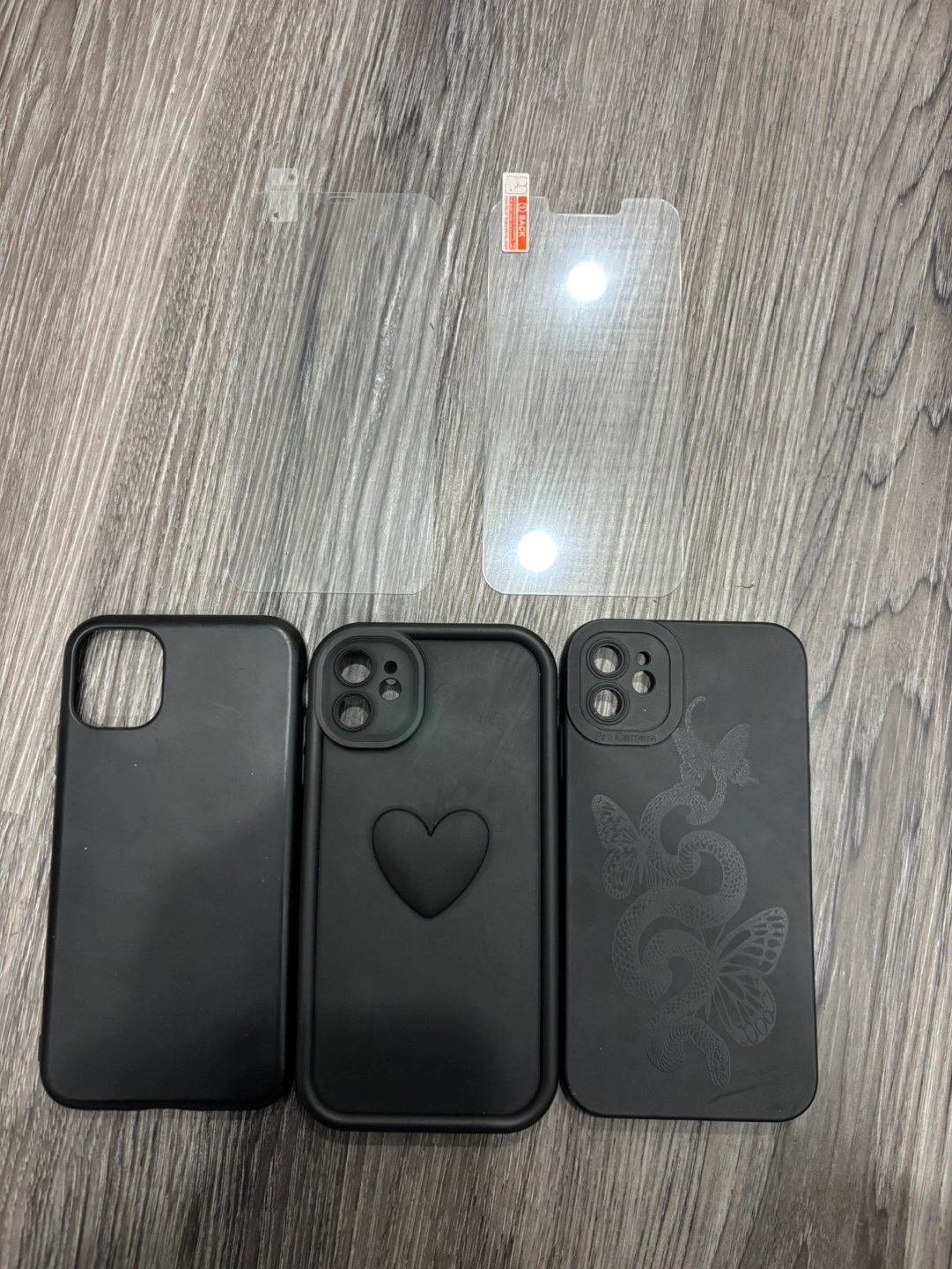 3 iPhone 11 Silicone Cases. All black. One case features a heart, one has a snake and butterflies and the last is plain + 2 Screen iPhone 11 screen guards