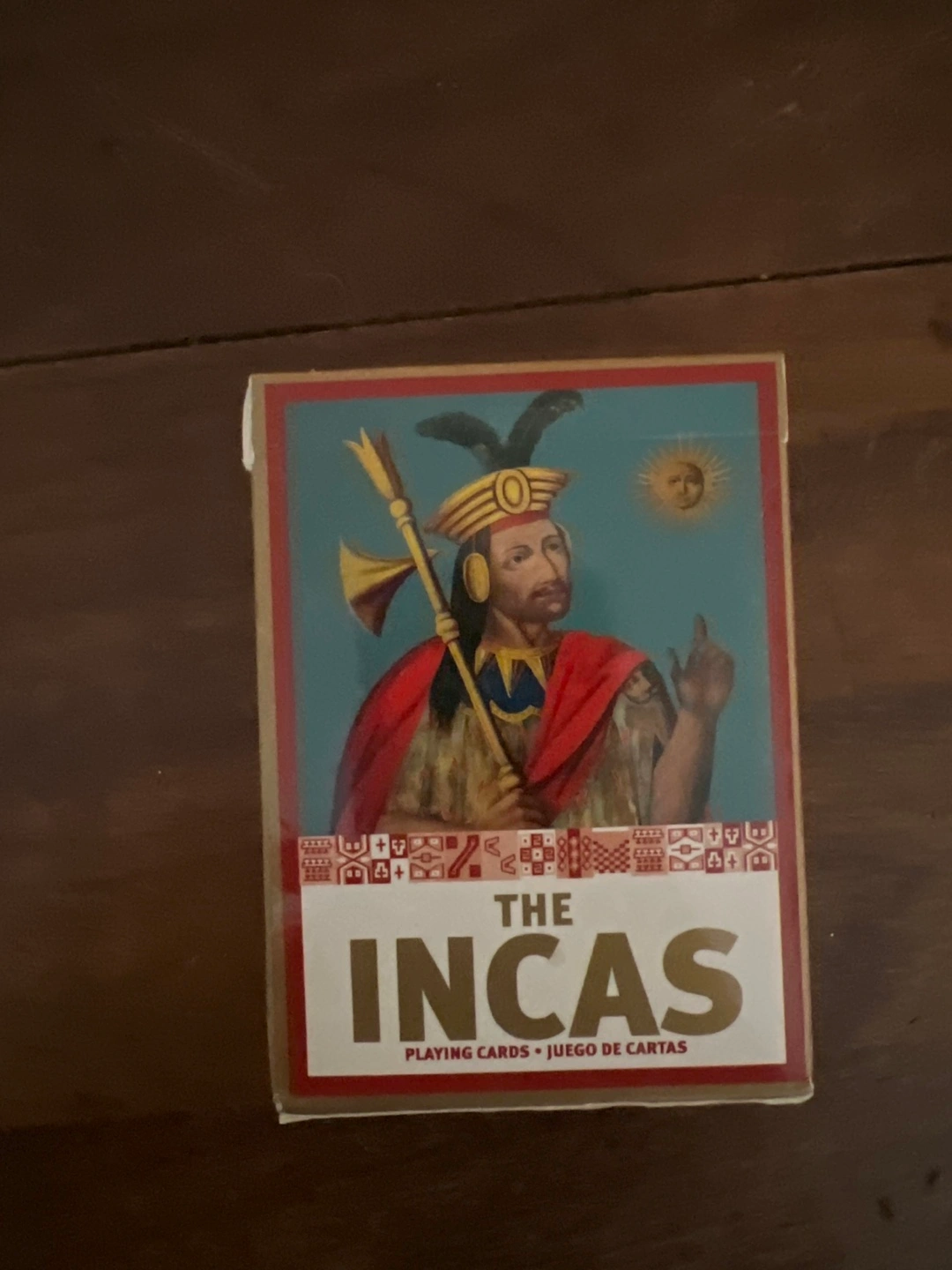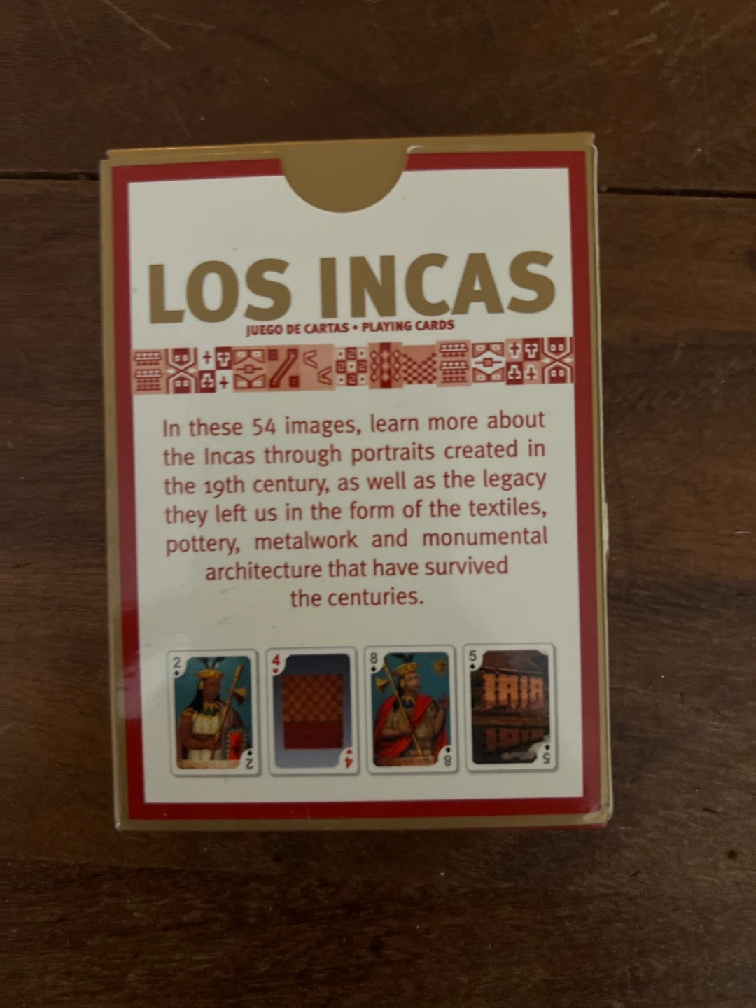 Playing cards with illustrations of Incan culture. 54 cards. All cards are there. Bought on vacation but haven’t used since. In like new condition.