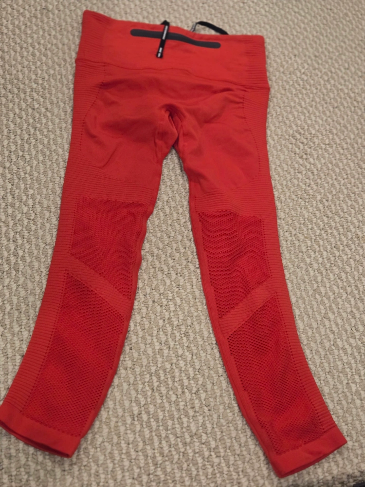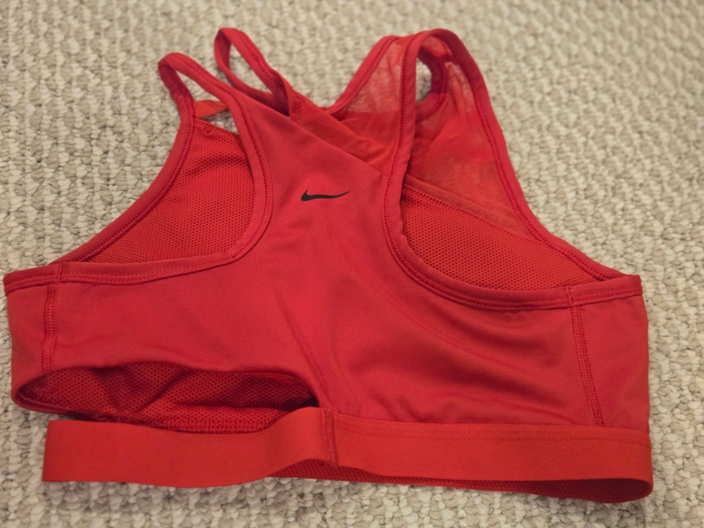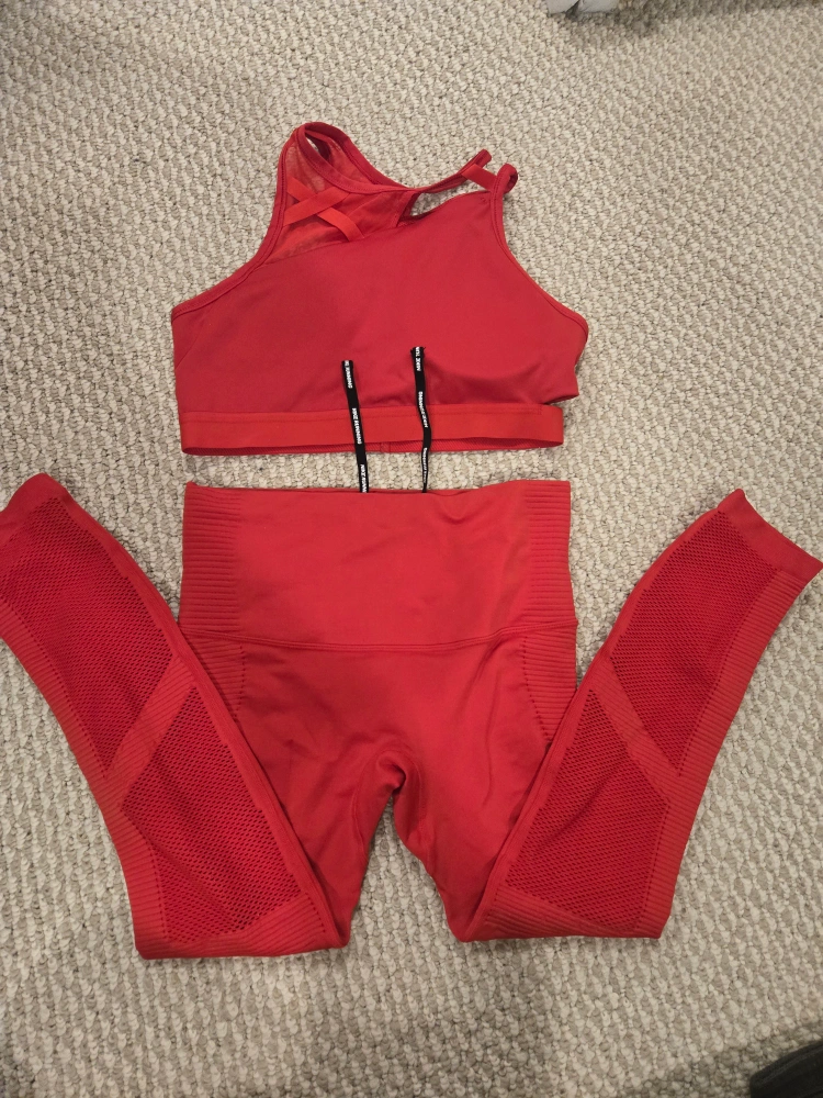 Red Nike sports bra and leggings set. The leggings have a mesh panel on the sides and a high waist. The sports bra has a racerback design and mesh panels.