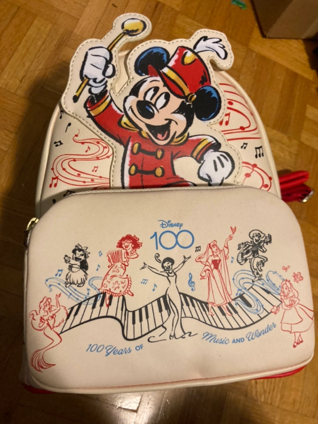 Mini backpack featuring Mickey Mouse as a musician, red trim, and a white background. The bag has a zipper closure and a small pocket on the front. Official Loungefly gear. Retails over $80.
