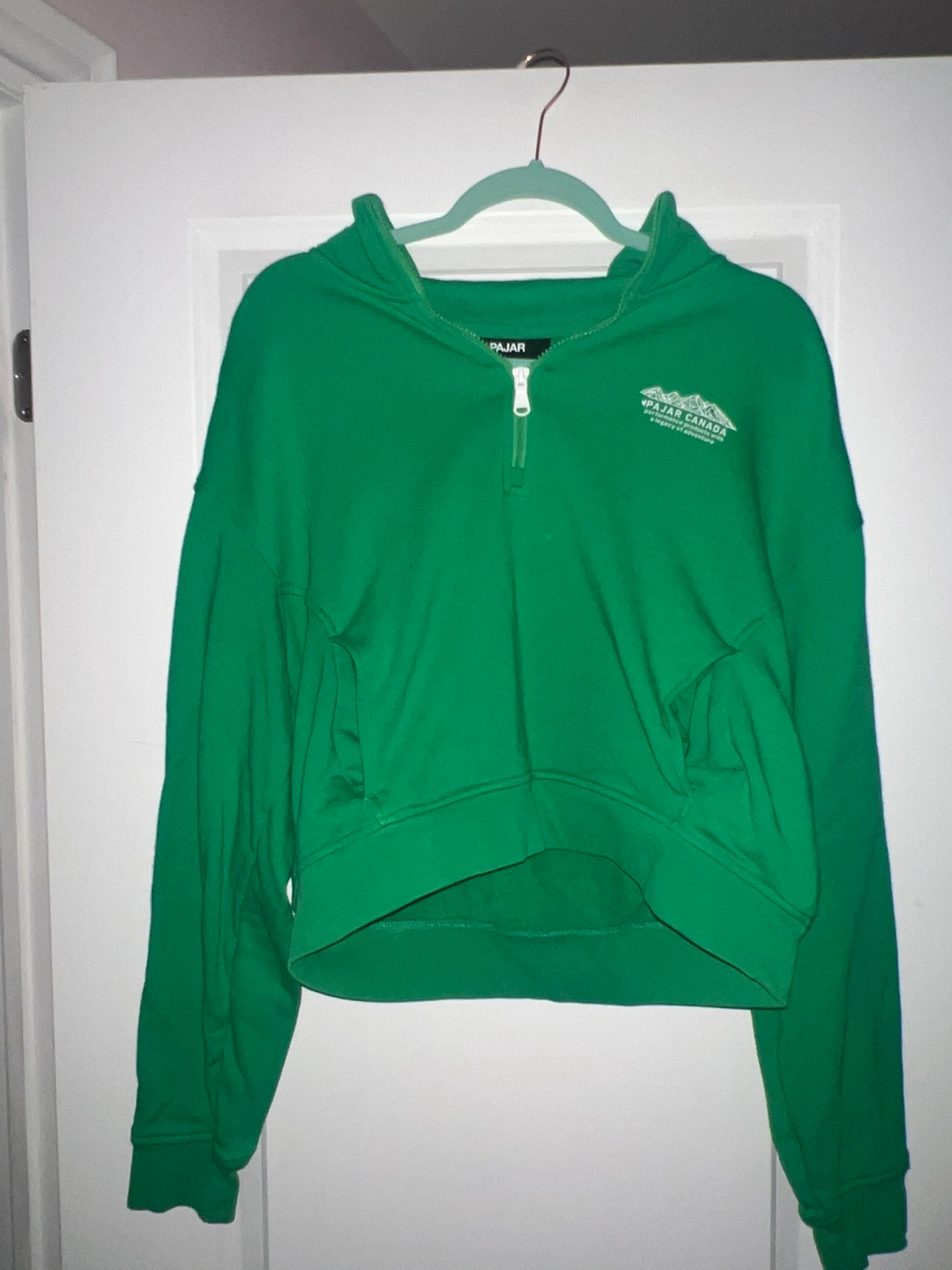 Green cropped hoodie with a zipper. Features Pajar Canada logo on the front.