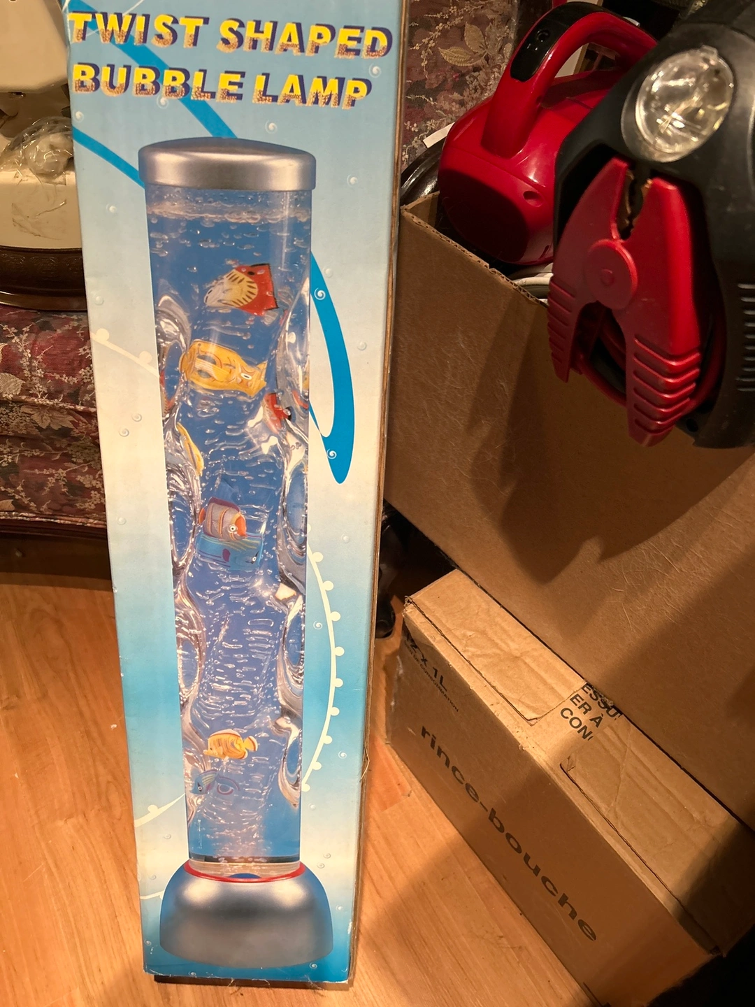 Twist shaped bubble lamp with fish and seahorse figurines. Includes original box.
