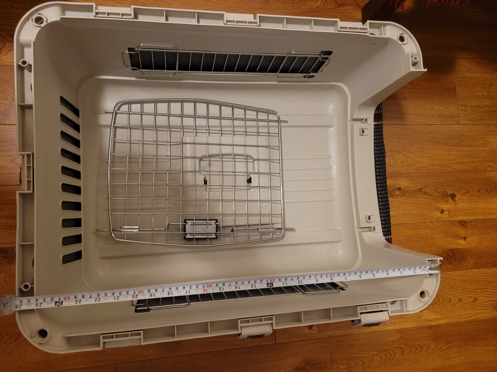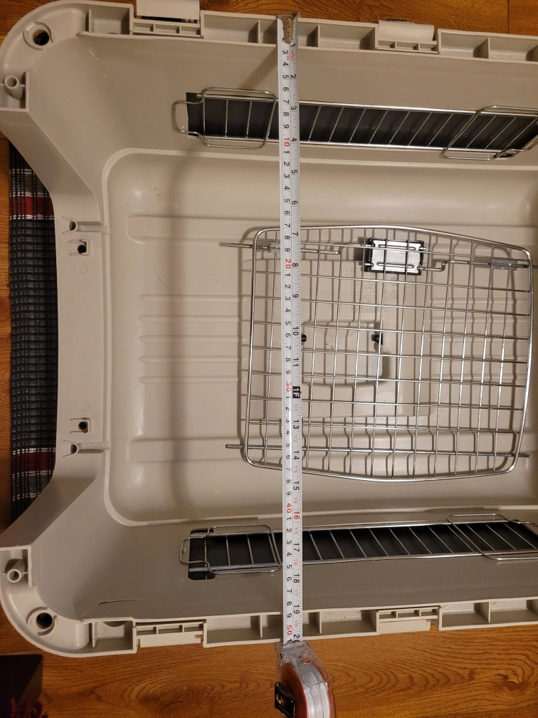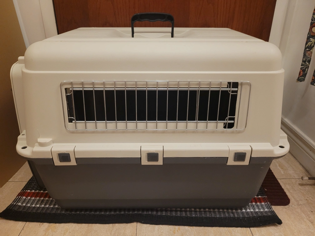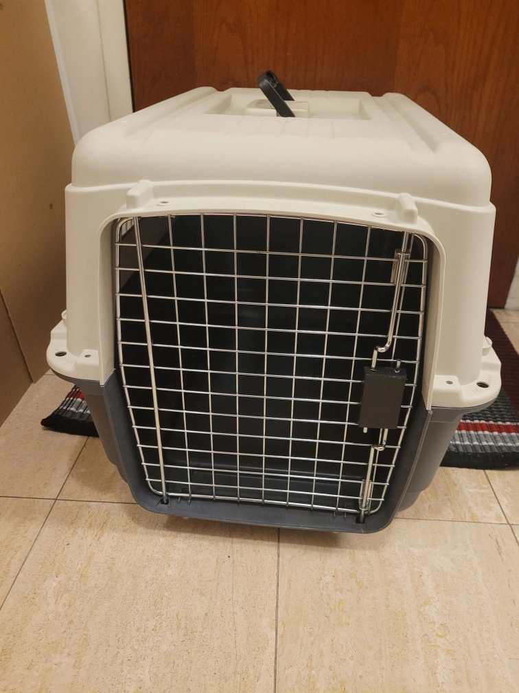 Large durable plastic dog kennel/carrier. approx 26x16x18 inches. function well, little crack on the corner. Serious buyer only.