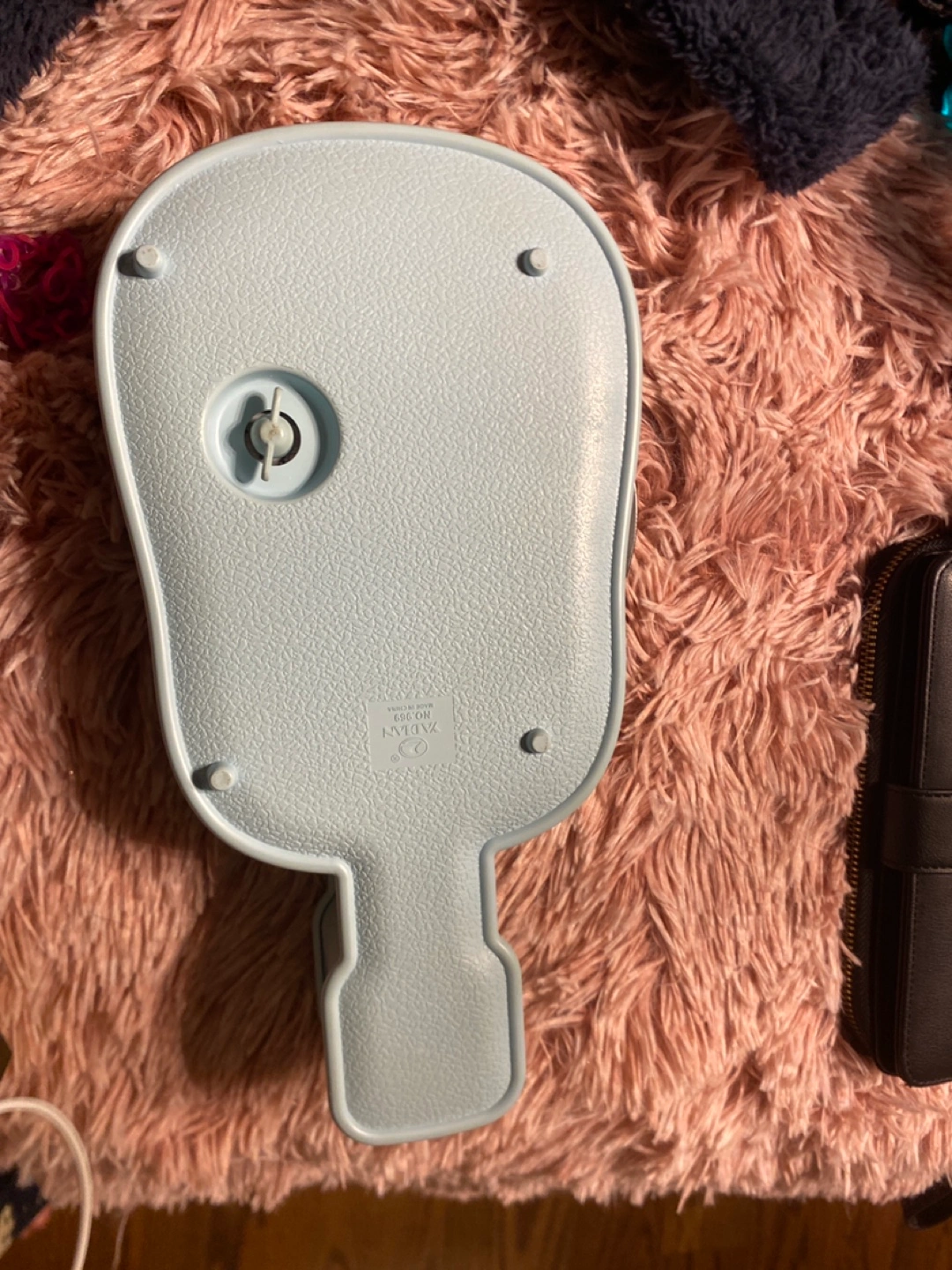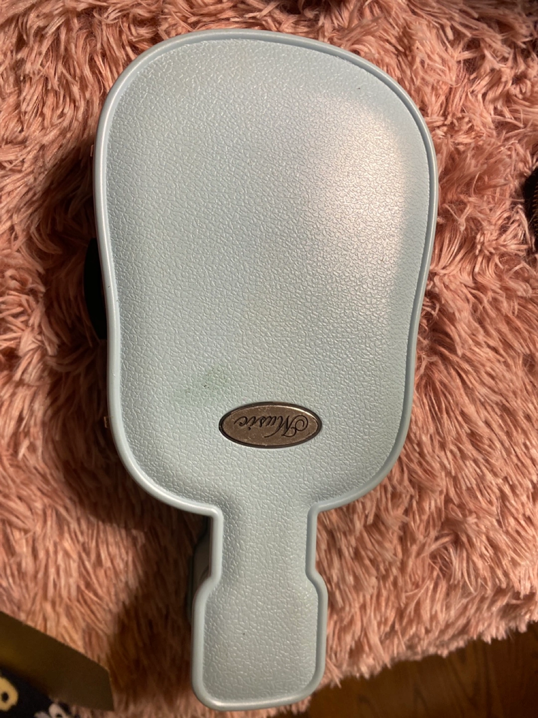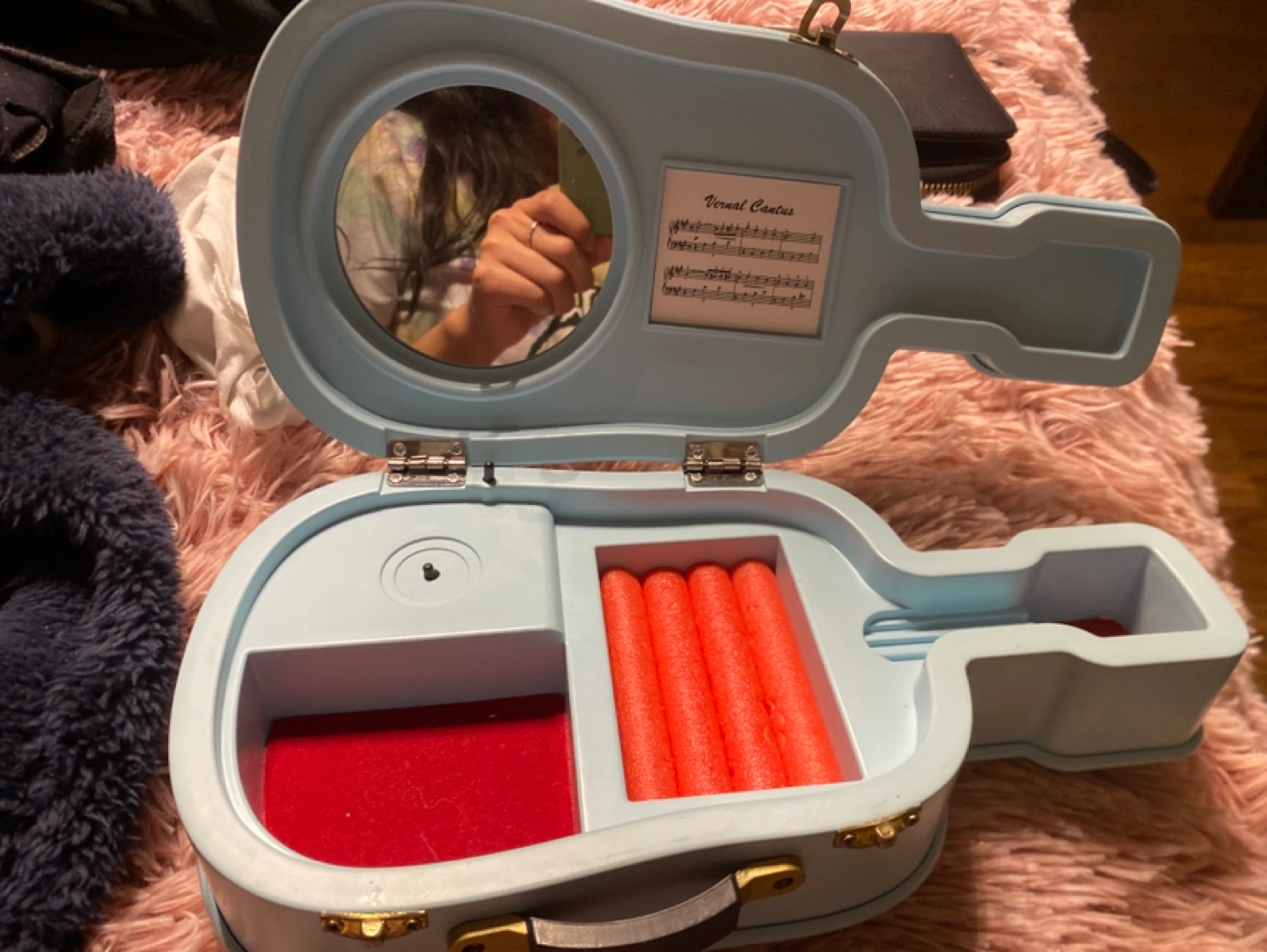 Blue guitar shaped music box with a mirror on the inside and a compartment for rings. Plays a song.