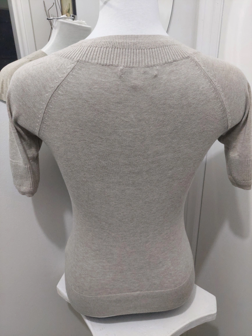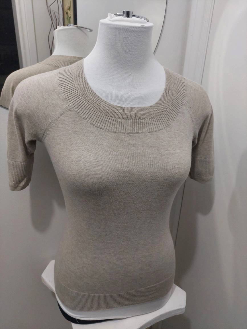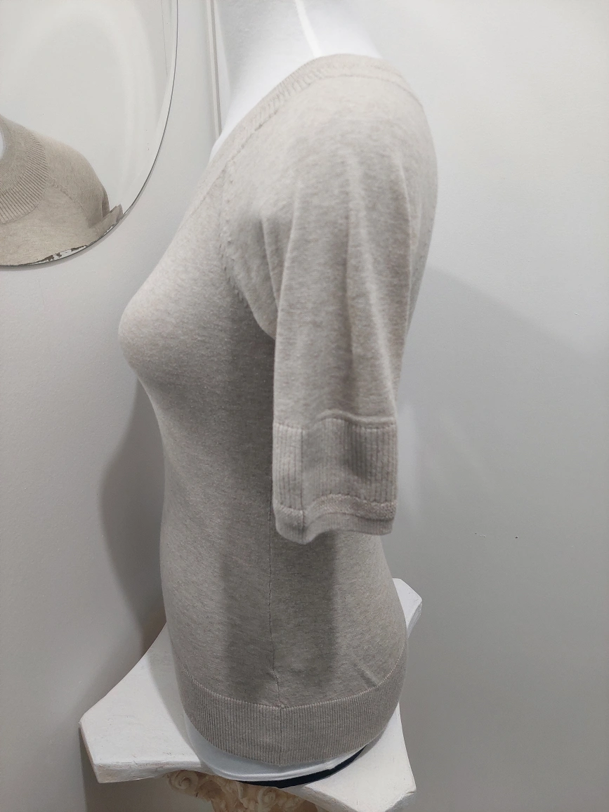 Elevate for wardrobe with this harrdly ever worned sweater It's a soft beige sweater with short sleeves. Ribbed neckline, cuffs, and hem. Feels very soft. From a clean smoke - and pet free home .