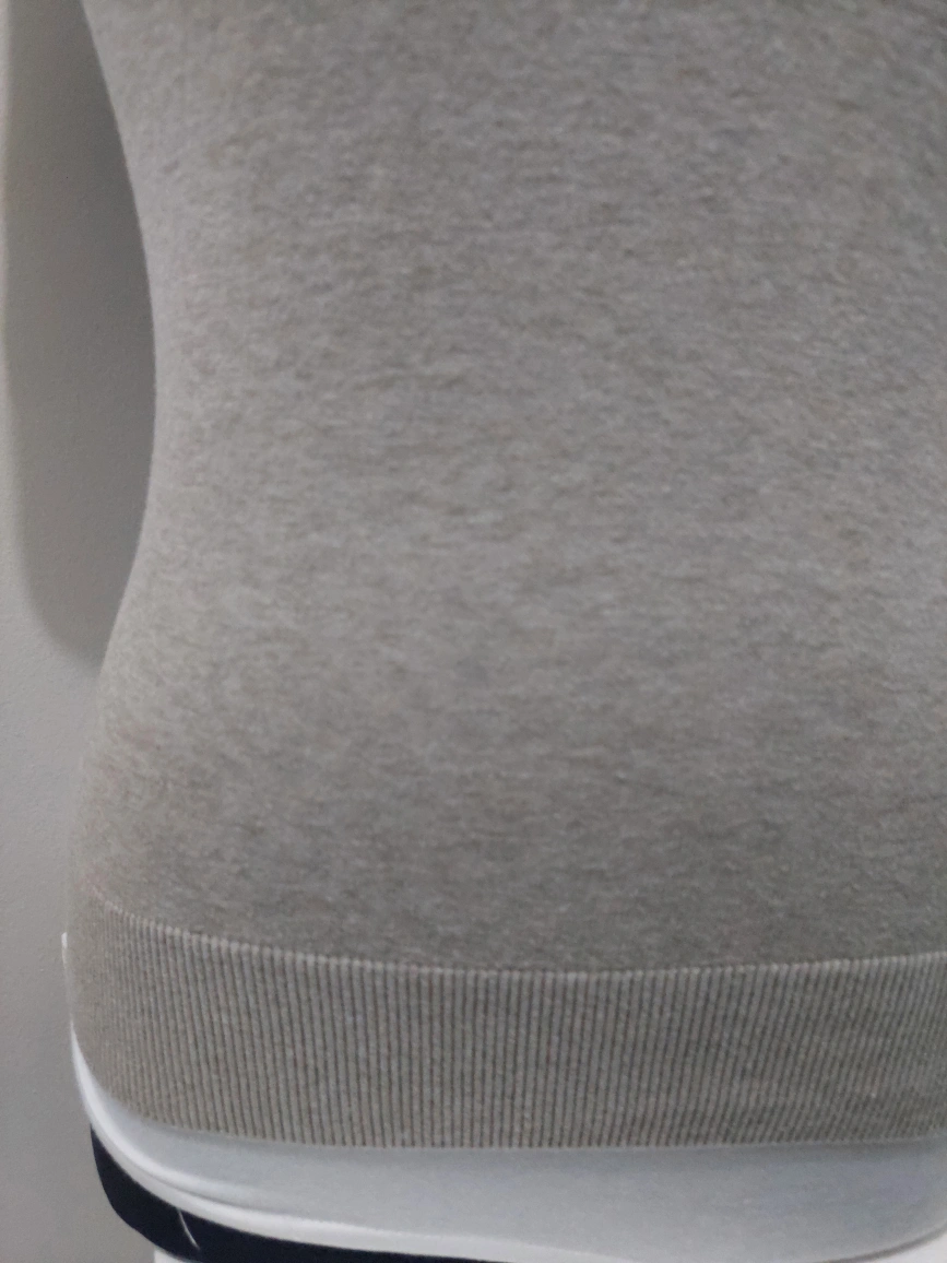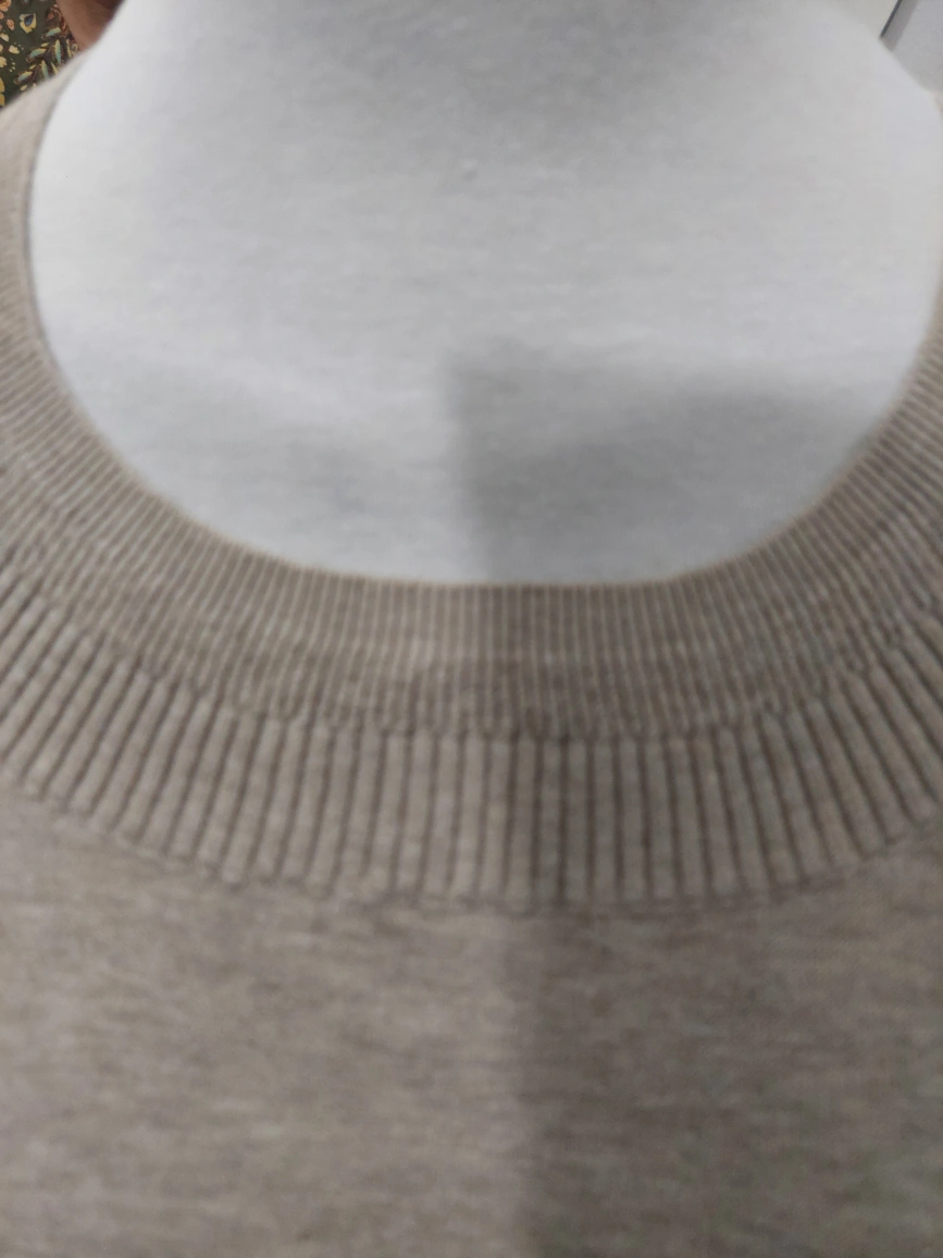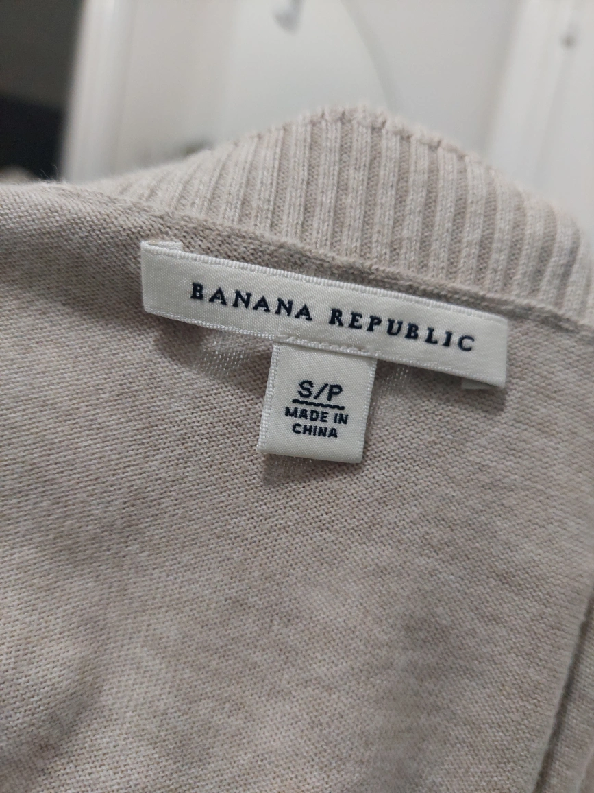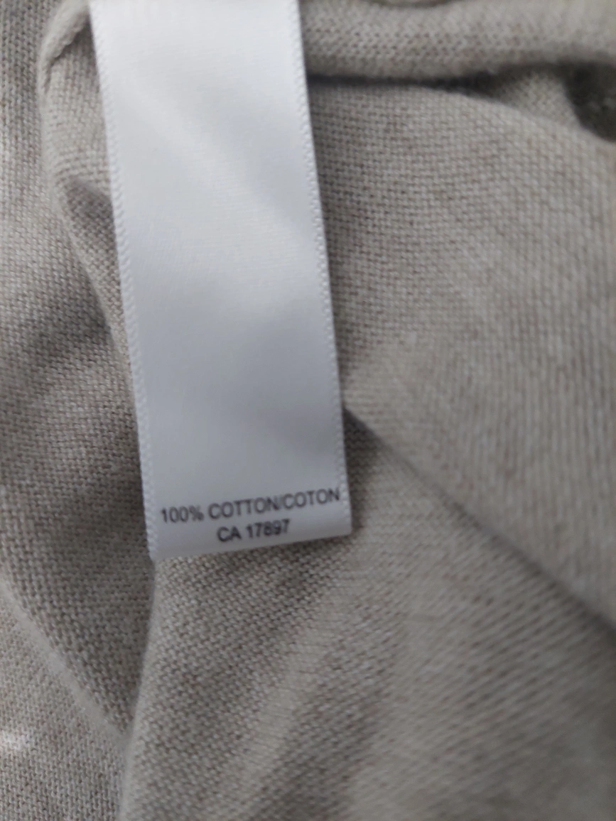 Elevate for wardrobe with this harrdly ever worned sweater It's a soft beige sweater with short sleeves. Ribbed neckline, cuffs, and hem. Feels very soft. From a clean smoke - and pet free home .