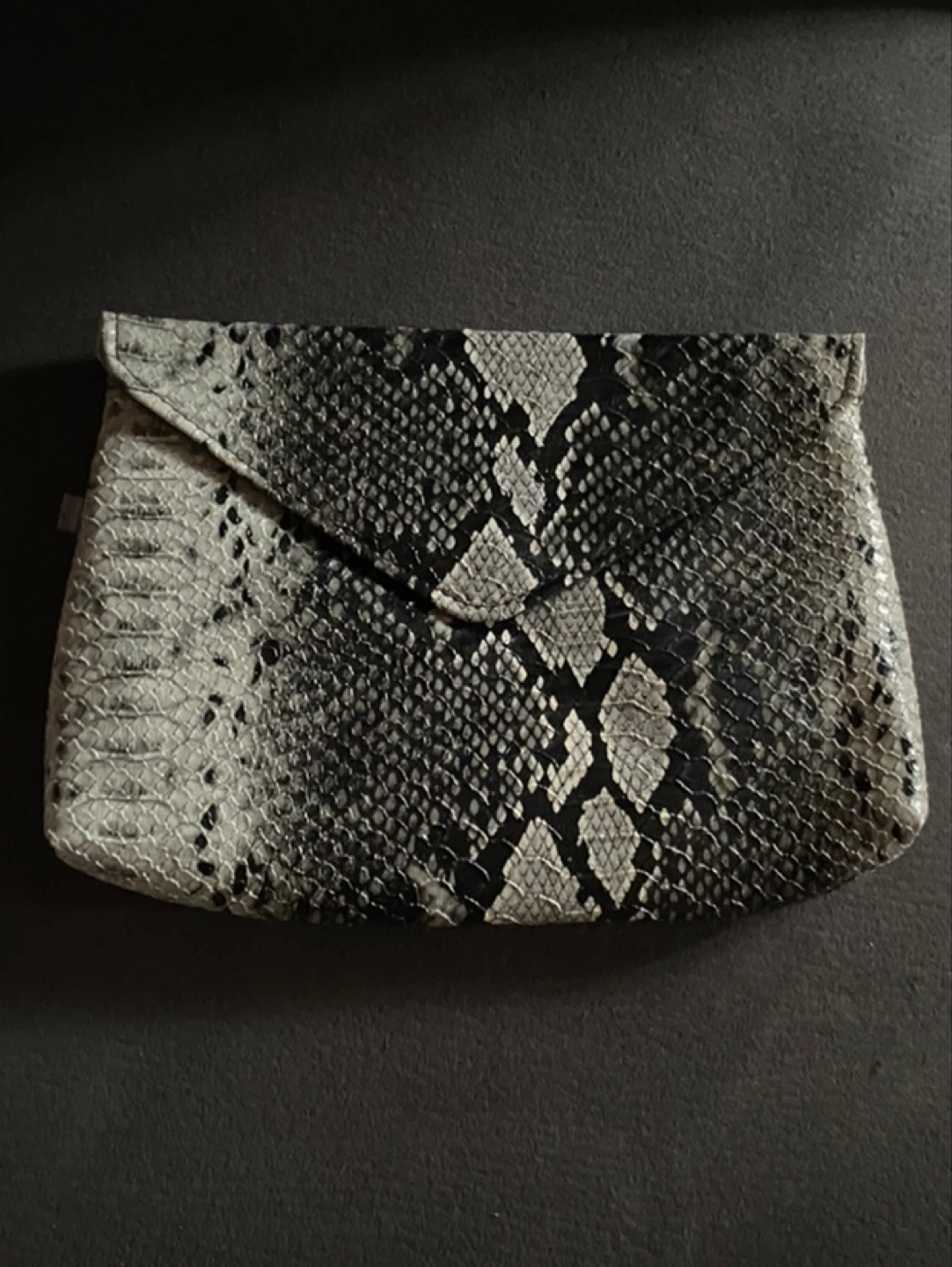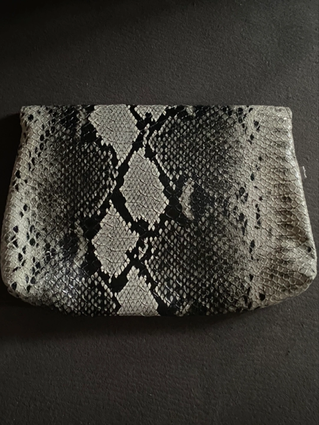 Snakeskin print clutch. Black and white pattern. Has a flap closure. Can be used as makeup bag as well.