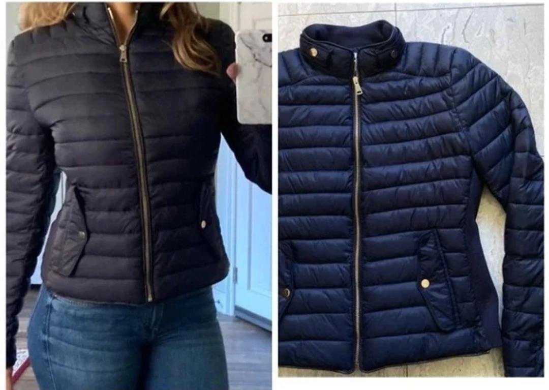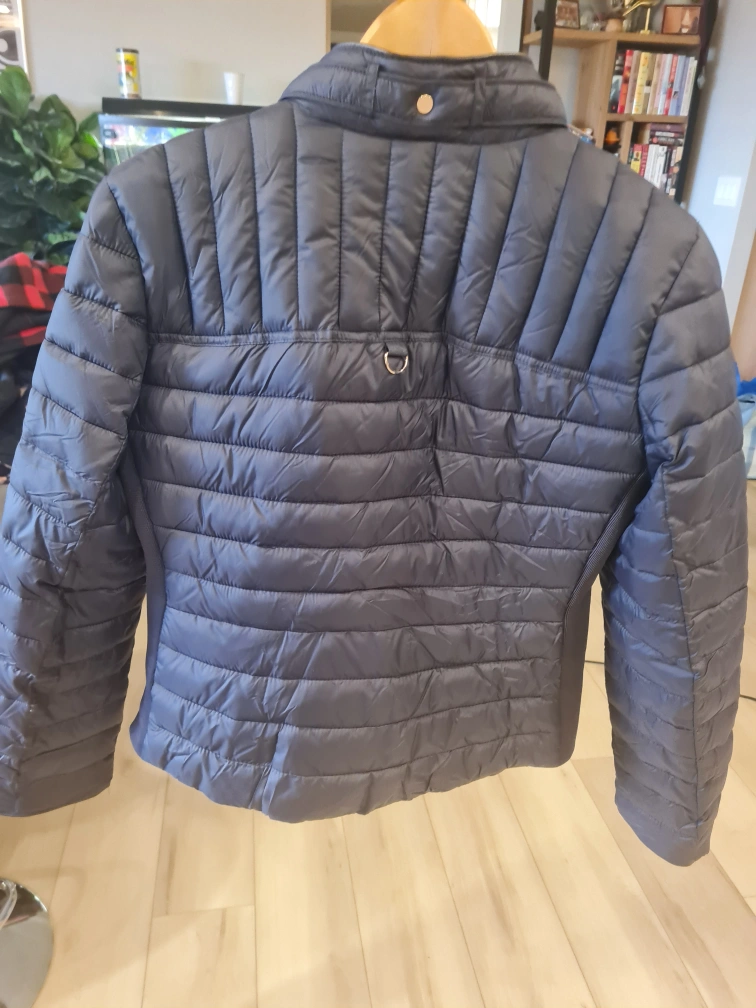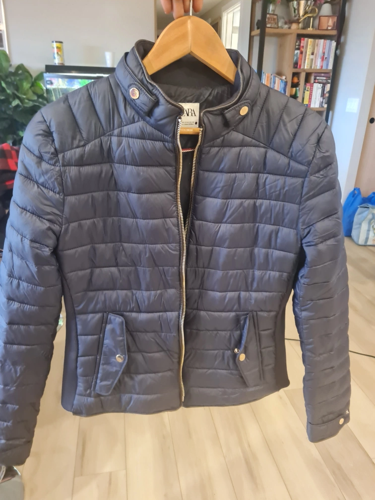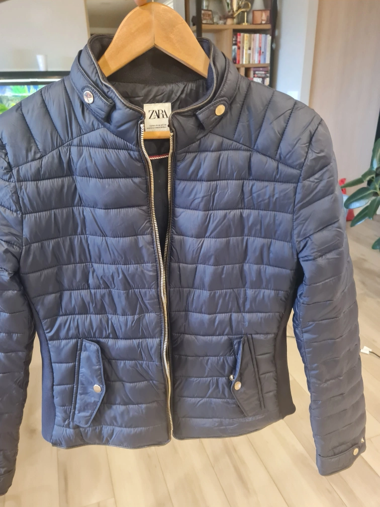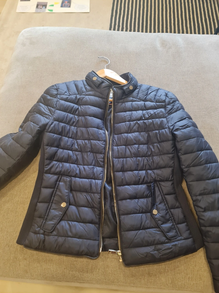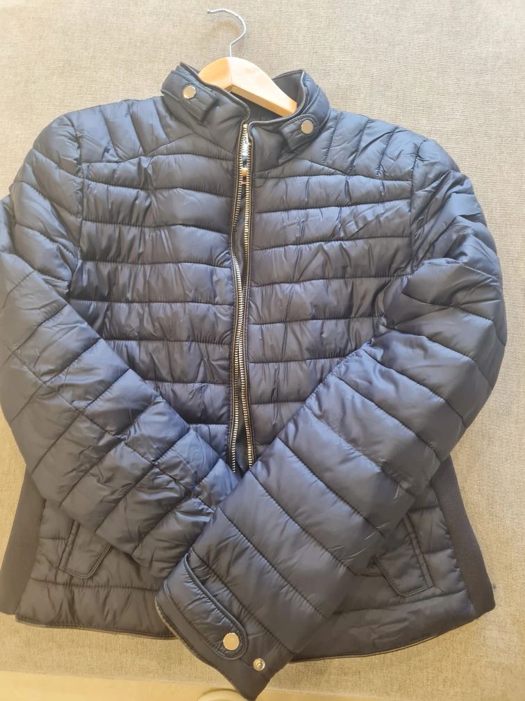 Black quilted jacket. Zipper closure. Two pockets. Long sleeves.