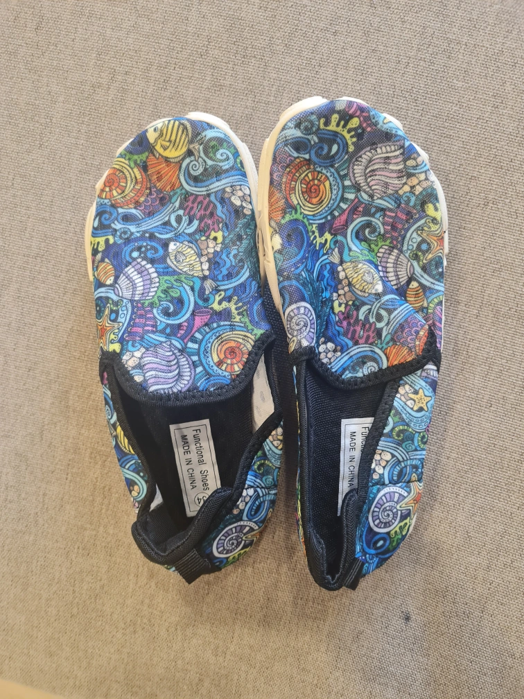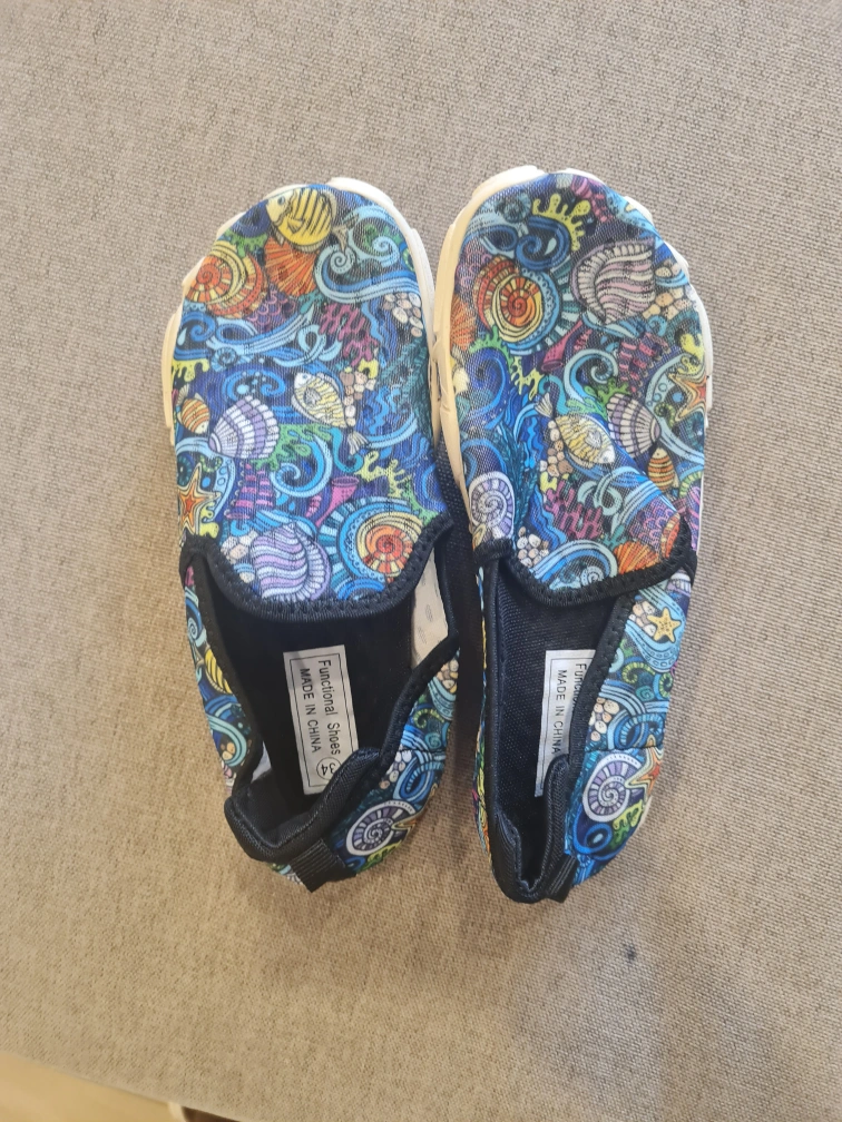 Blue, yellow, and green patterned water shoes with black trim. swimming shoe