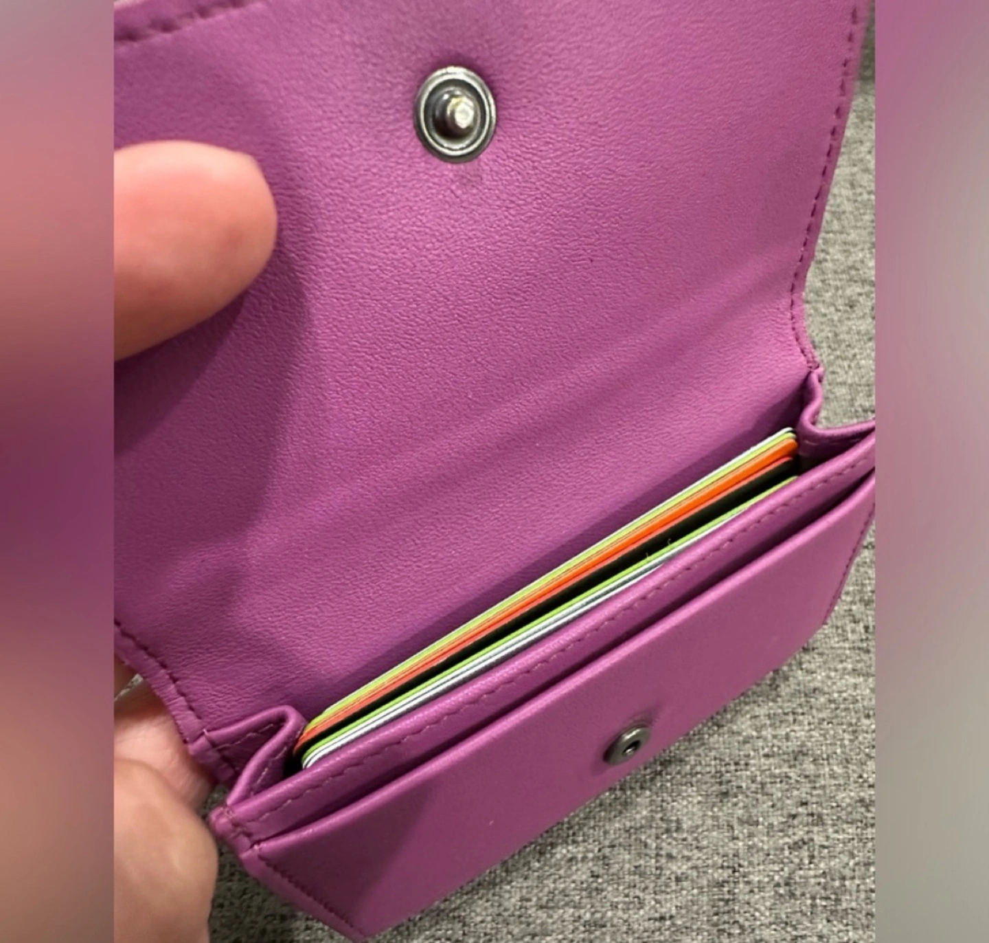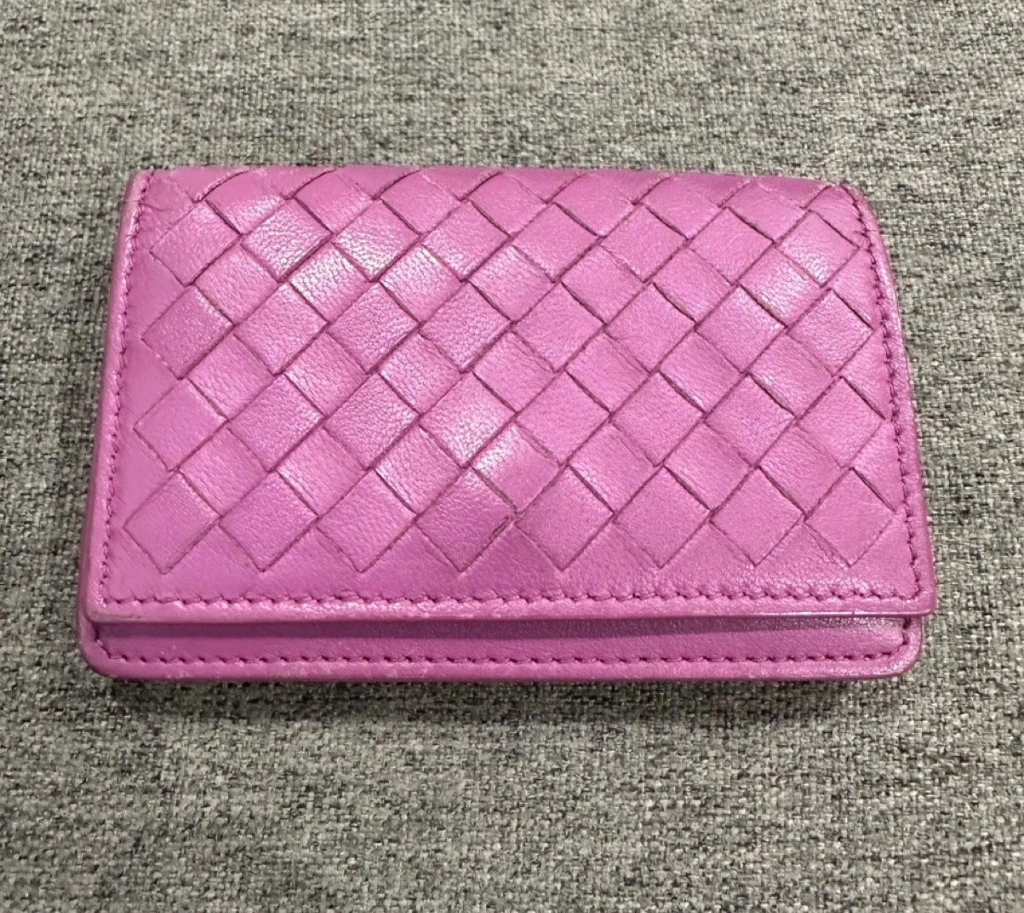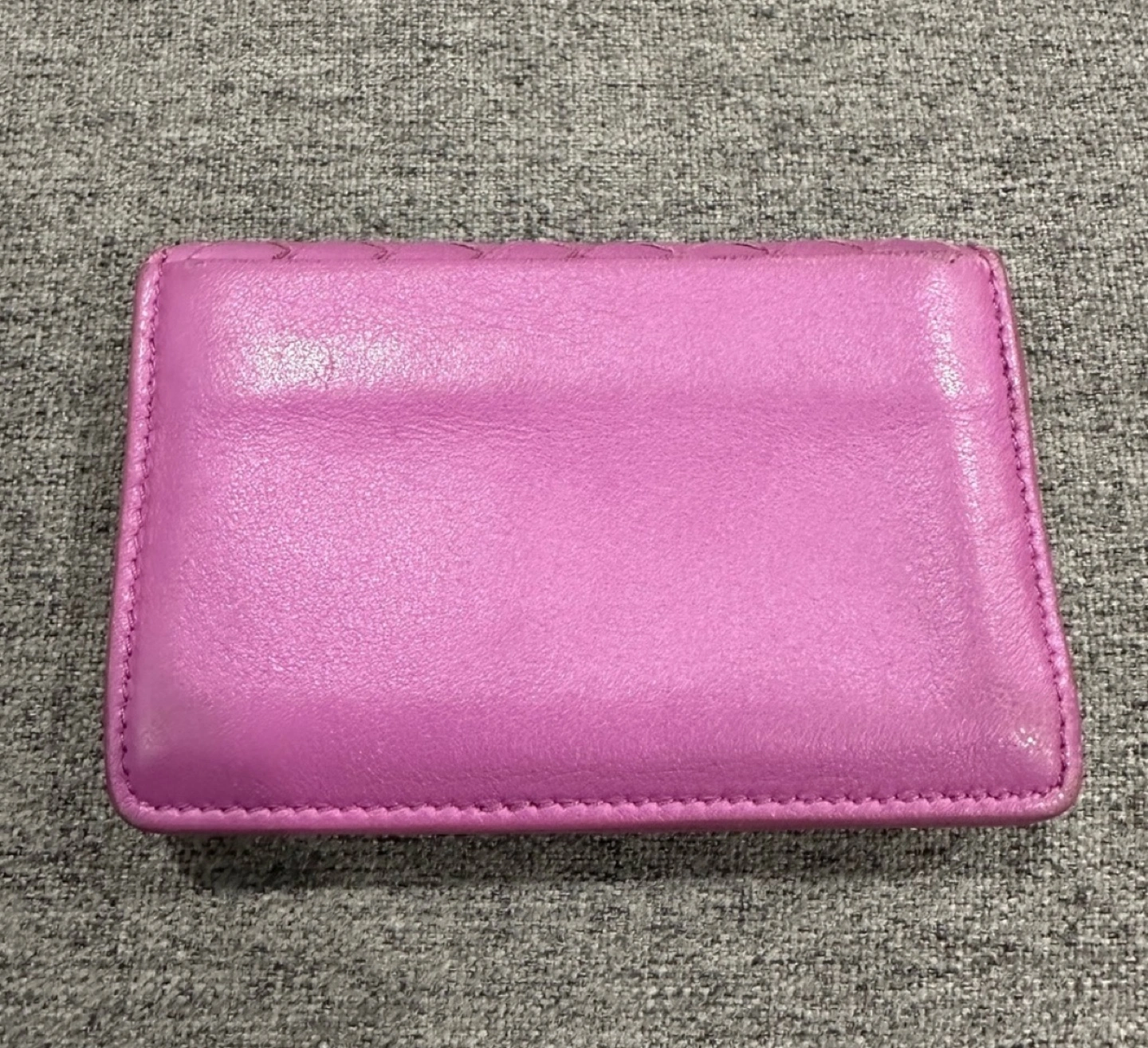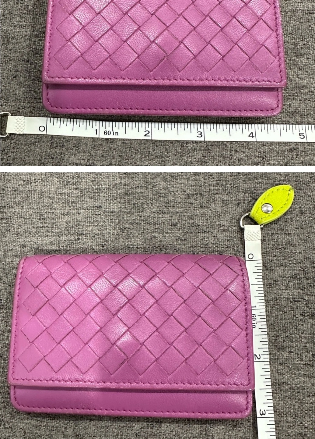 💯 Authentic Bottega Veneta Card Case with snap button closure. Purple leather with leather lining & single Interior Pocket with Card Slots. I put 9 cards for capacity reference and it didn’t look bulky. In good preloved used condition. There are no stains or color transfers. There are minimal rubbings and crackings as highlighted in the posted images. The minimal flaws mentioned don’t affect the full functionality of this card case. Still in bright purple color. Please refer to images for measurements.