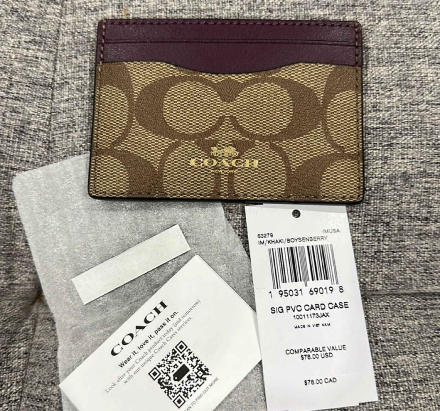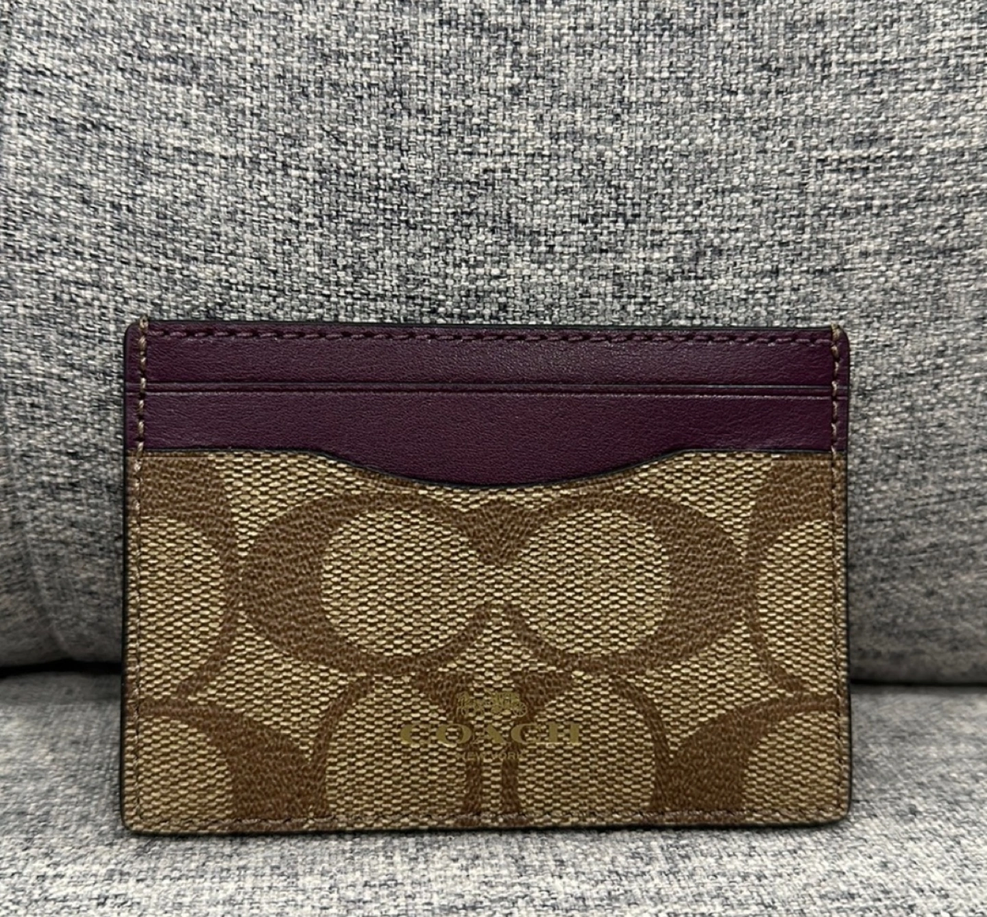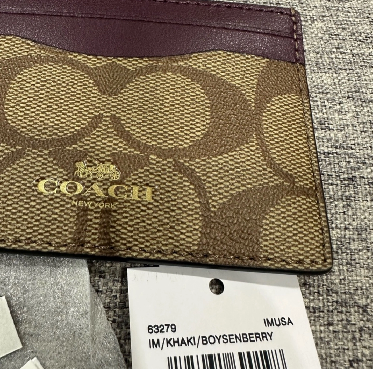New with tags. Brown and burgundy. Signature Coach pattern. COACH card holder in brand new condition. As per image, in khaki and boyseberry color. Has 5 card slots.