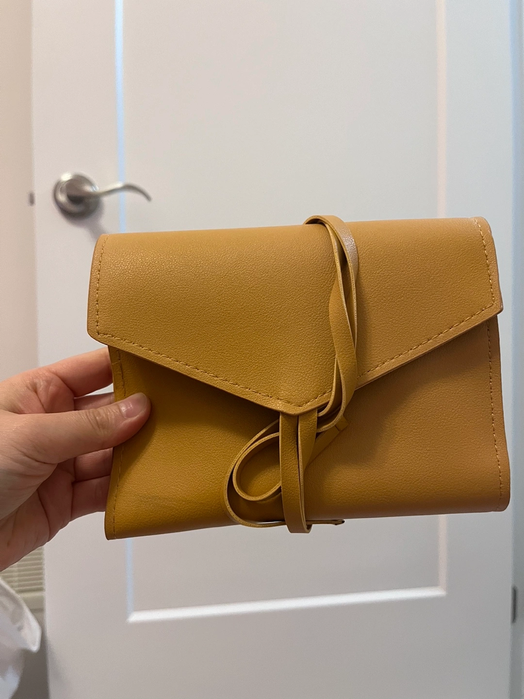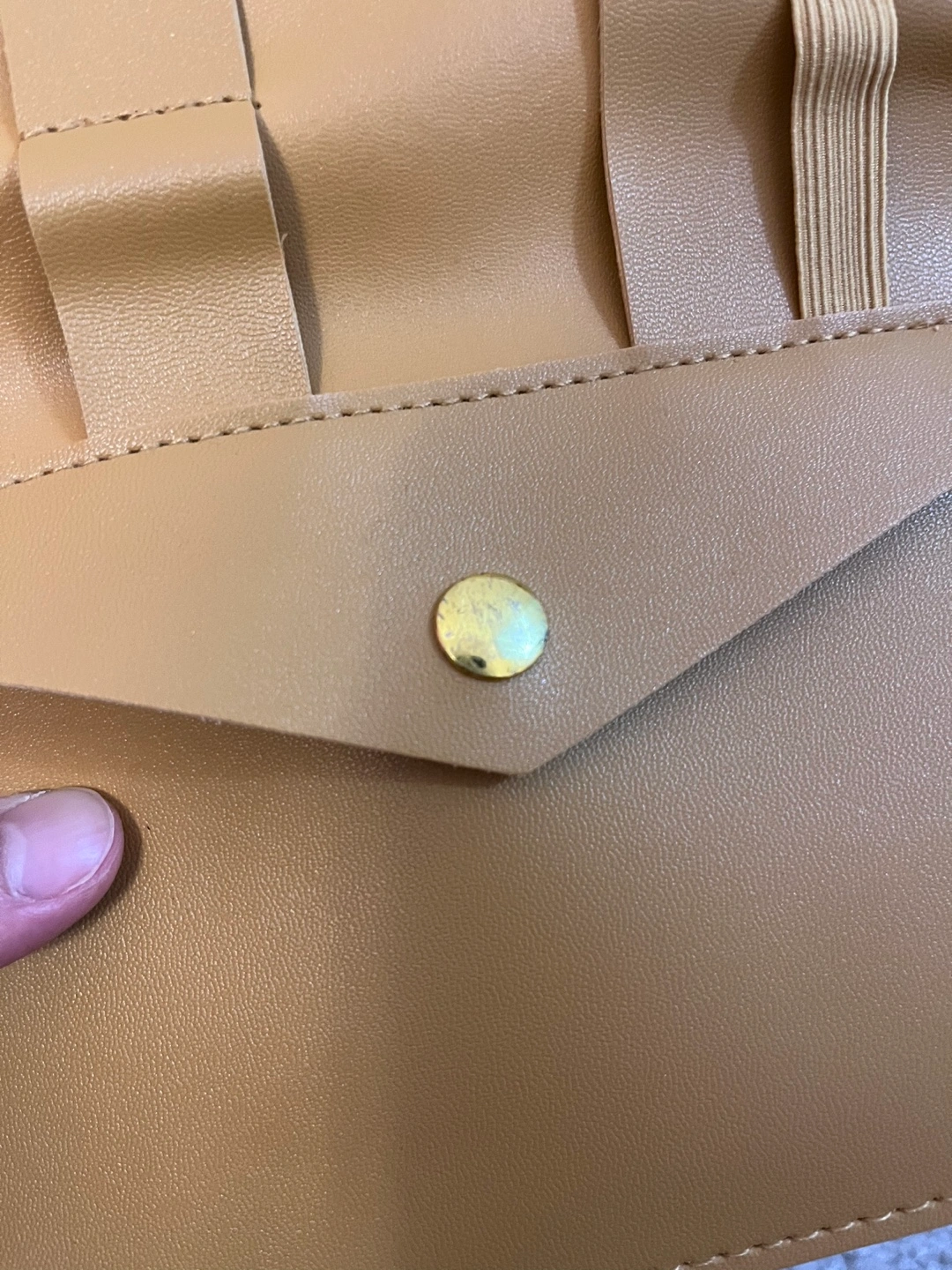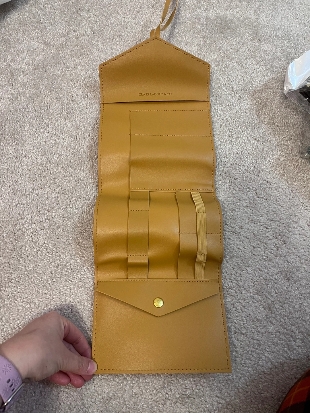 Leather like material Great for jewellery or for makeup Has some marks as seen in the picture and some rusting on the gold button part Haven’t used it but was in storage for a long time Porch pick up in Markham