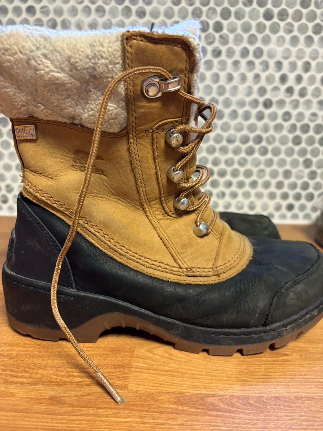 Brown leather winter boots. Lace-up style with metal eyelets. Waterproof.