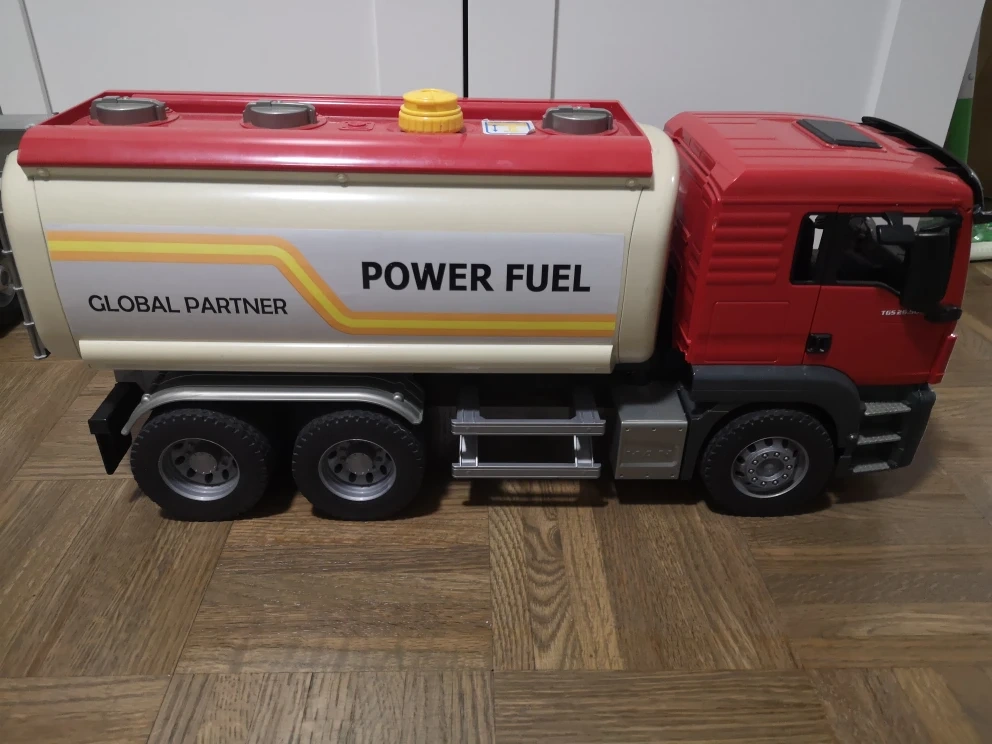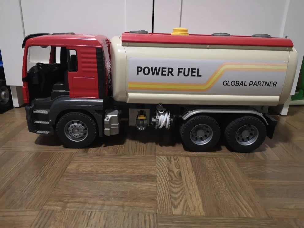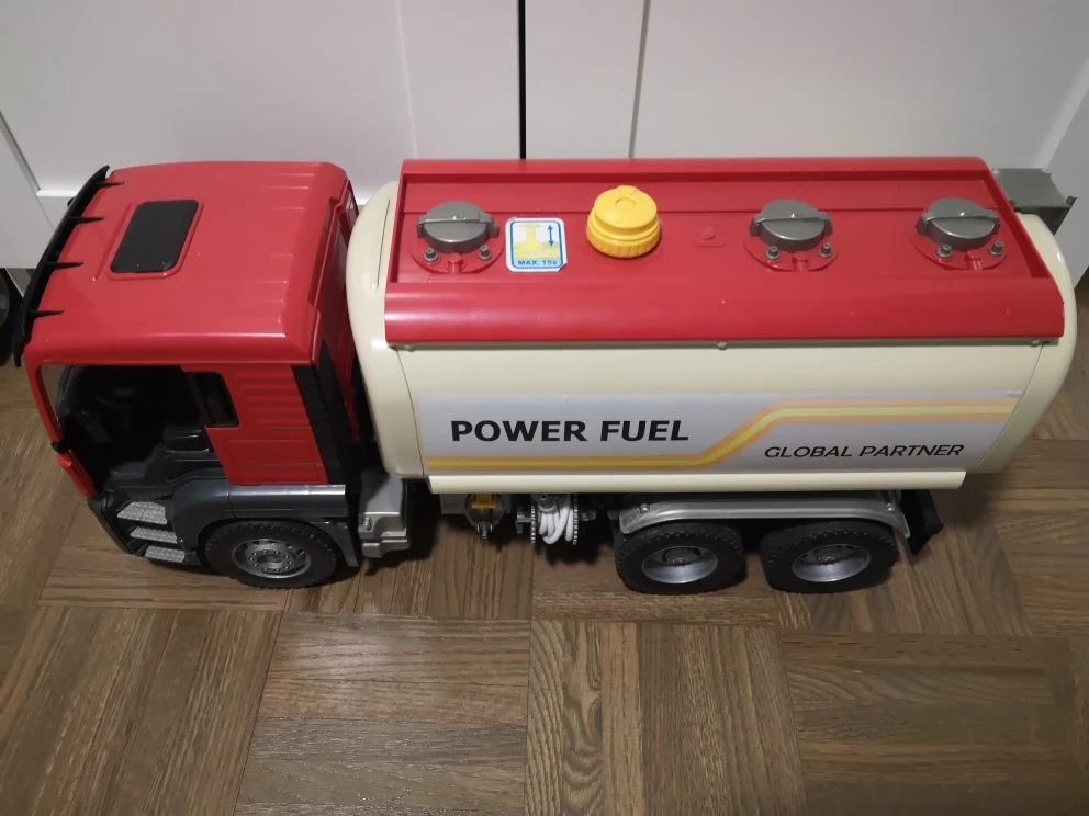 Large toy truck. Well loved, one door is missing. Can fill tank with water and use attached hose to spray.