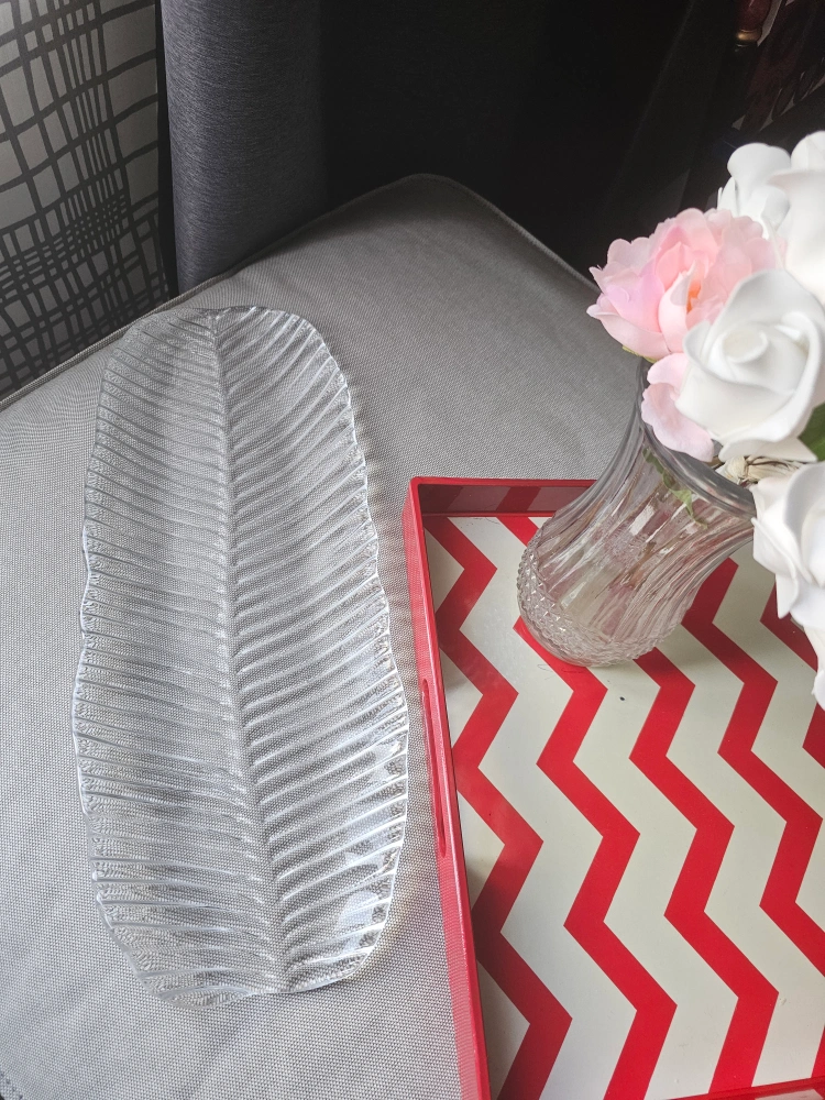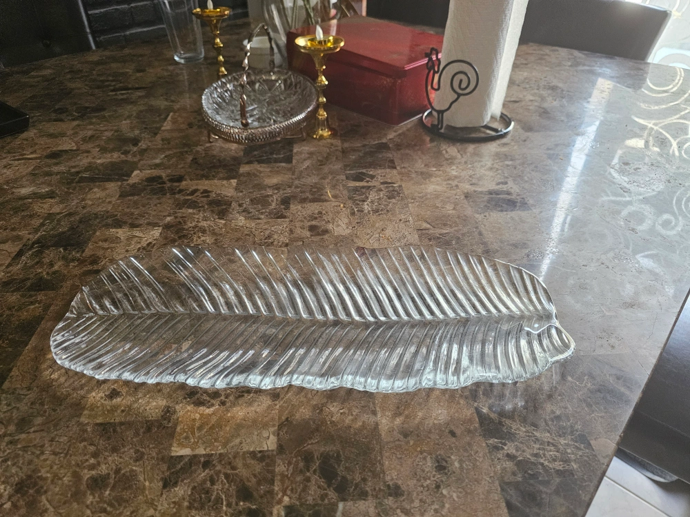 Downsizing - #thriftypicks glass platter shaped like a leaf. Great for serving cheese, crackers, or other snacks. Meet up at Dairy Queen Towerhill or Sheppard Yonge station