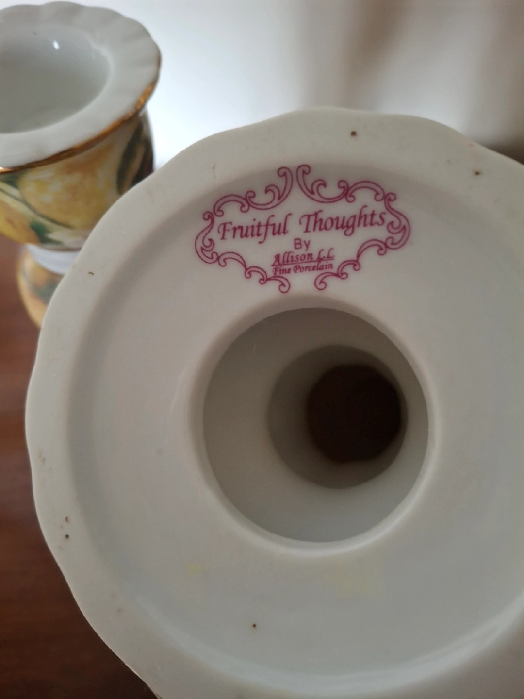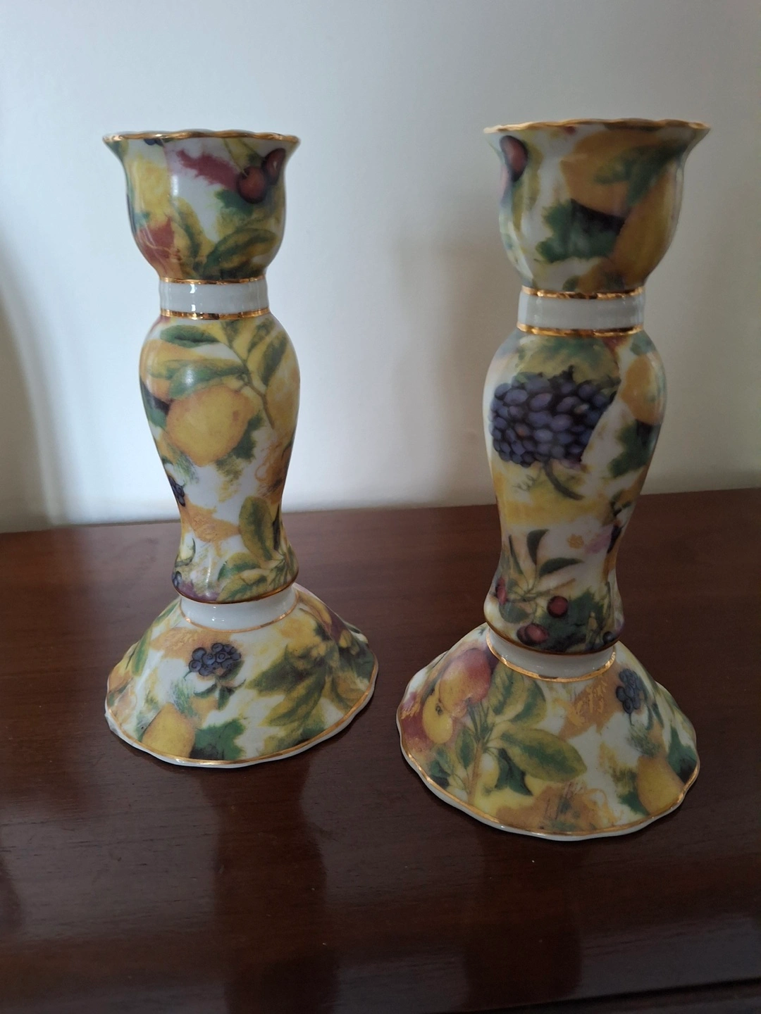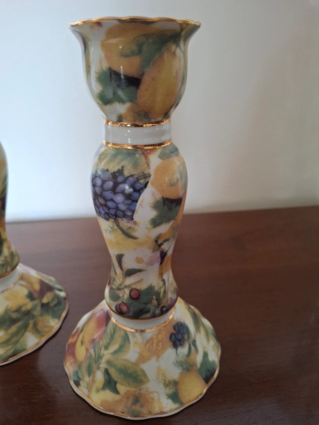 Pair of candle holders with a fruit motif. Fine white porcelain with gold trim. 6.5” high. Price is for both. Available for pickup in Markland Wood.