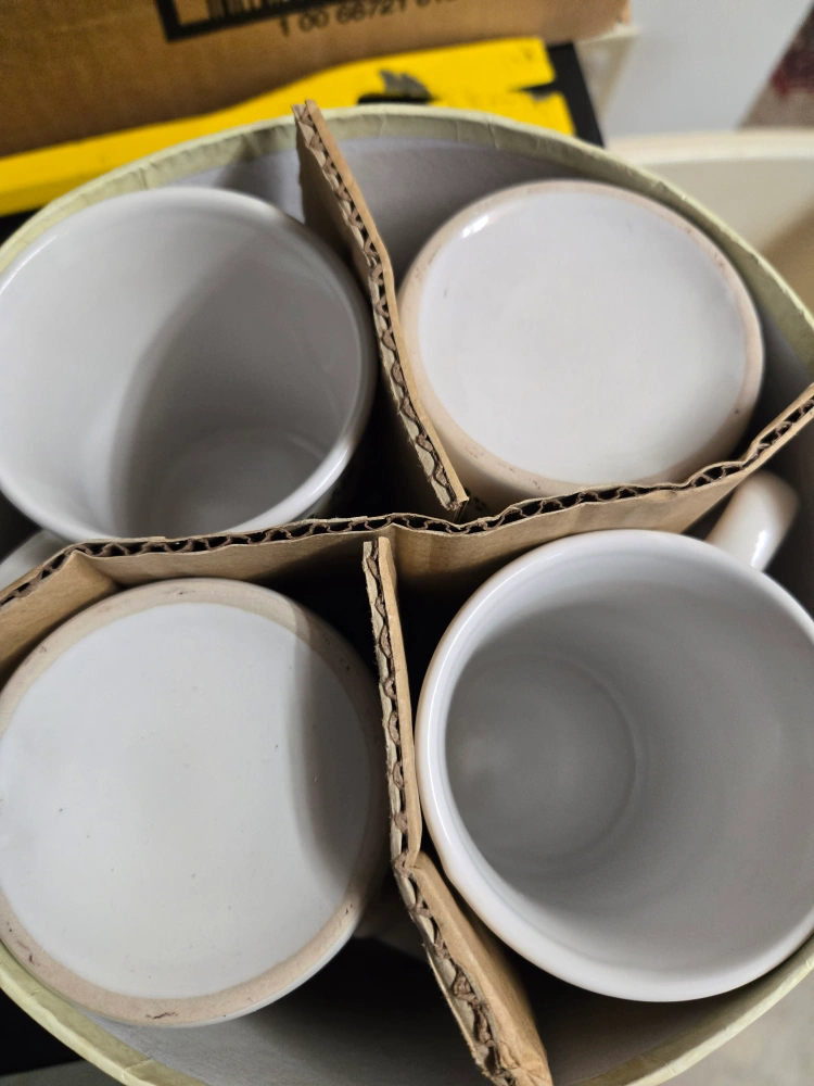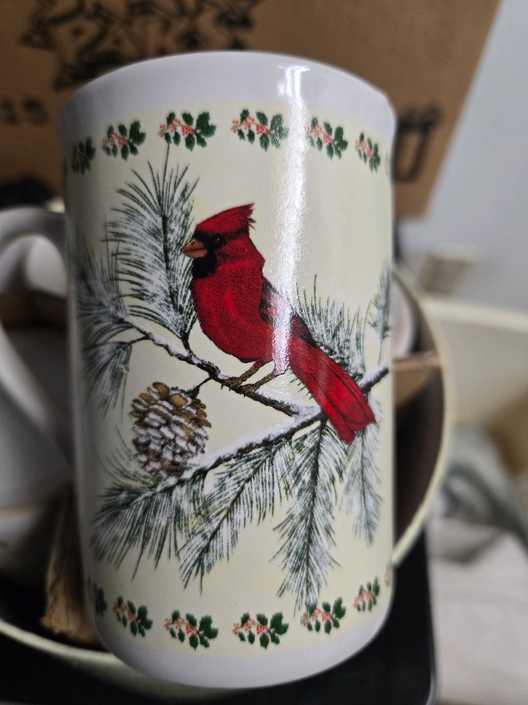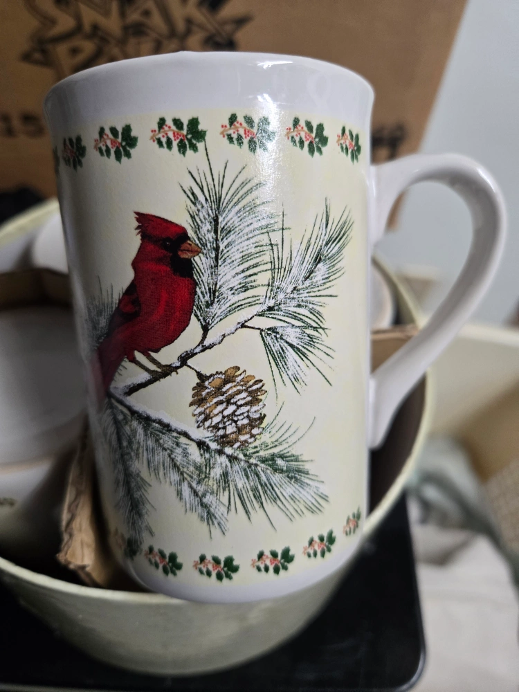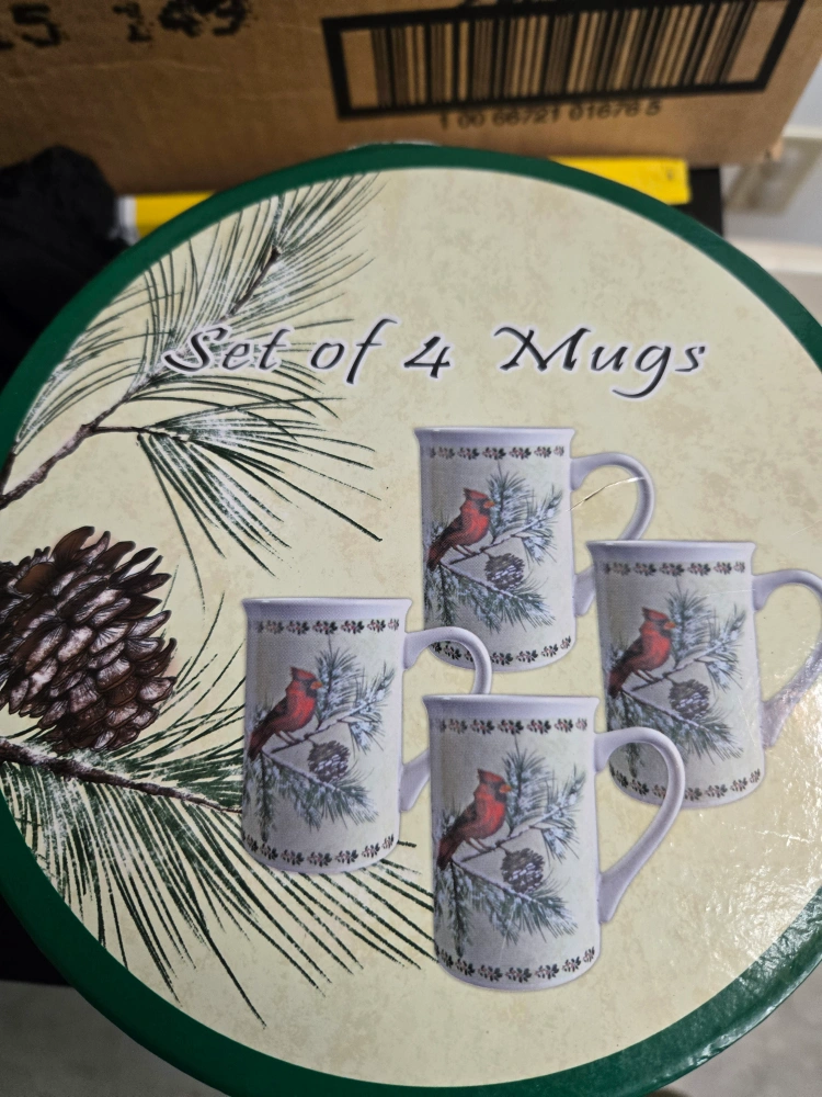 Set of 4 mugs with a cardinal and pine cone design. They are new in box.