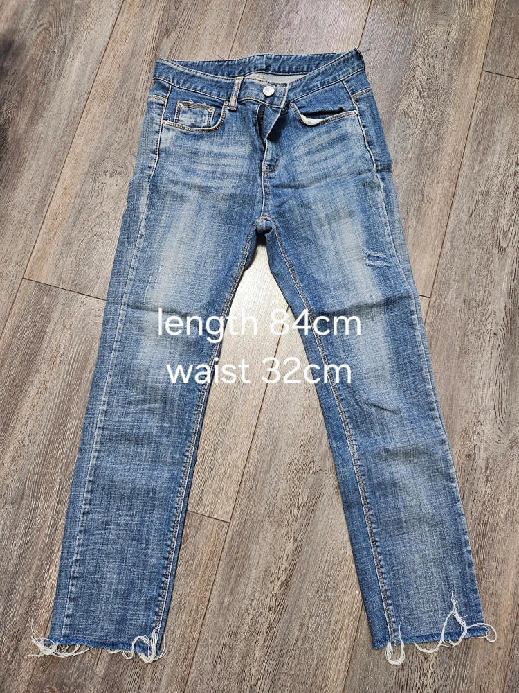 Distressed denim jeans with a frayed hem. crop skinny fit Size 32 waist, 84 cm length.
