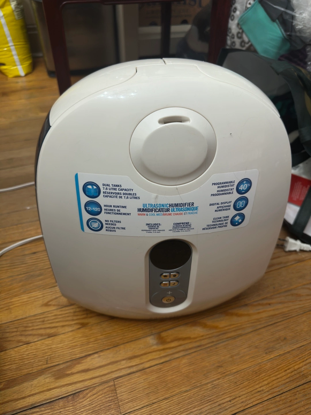 Dual tank humidifier with 40 hour runtime. Includes a digital display and a clear tank.