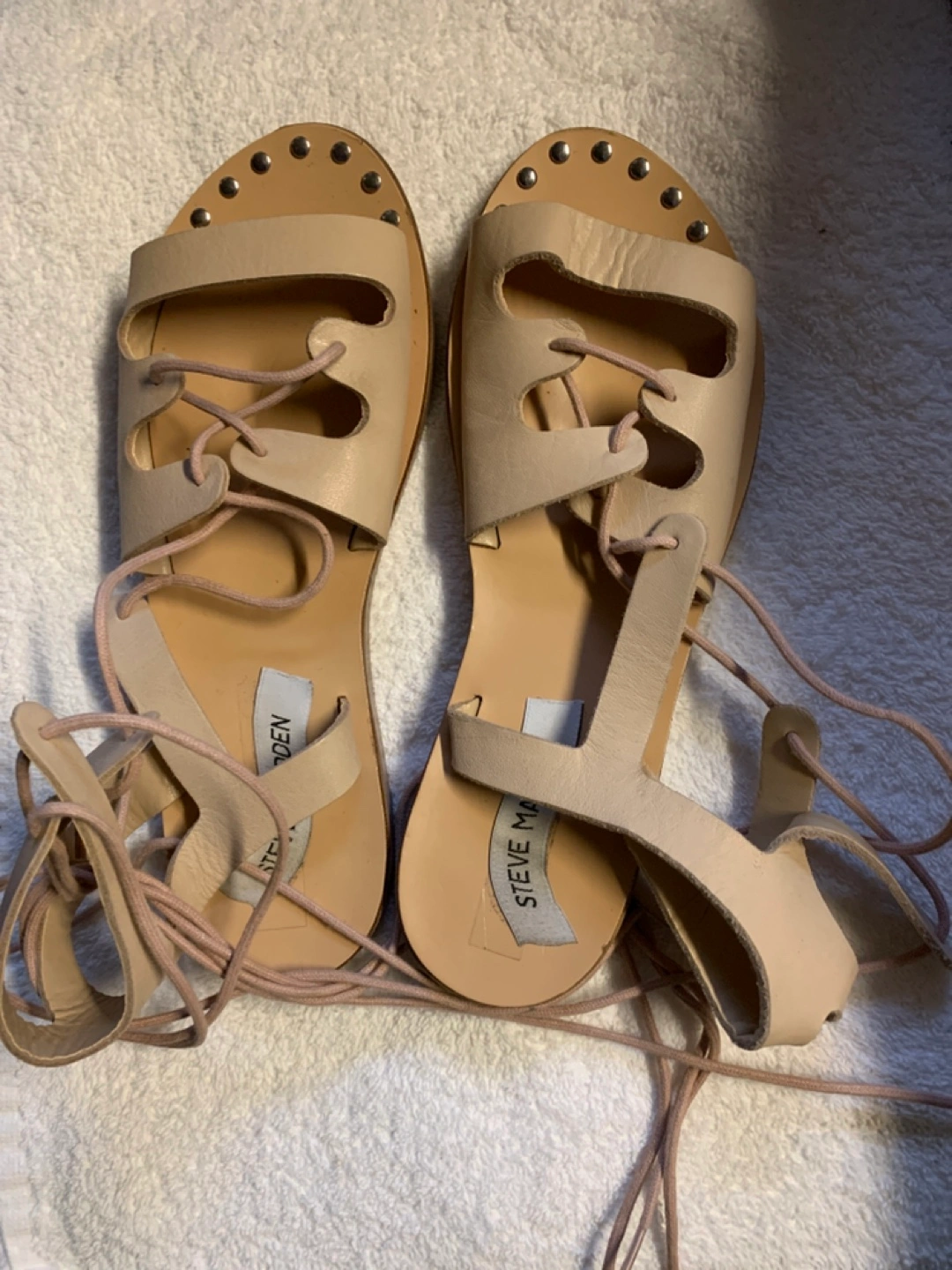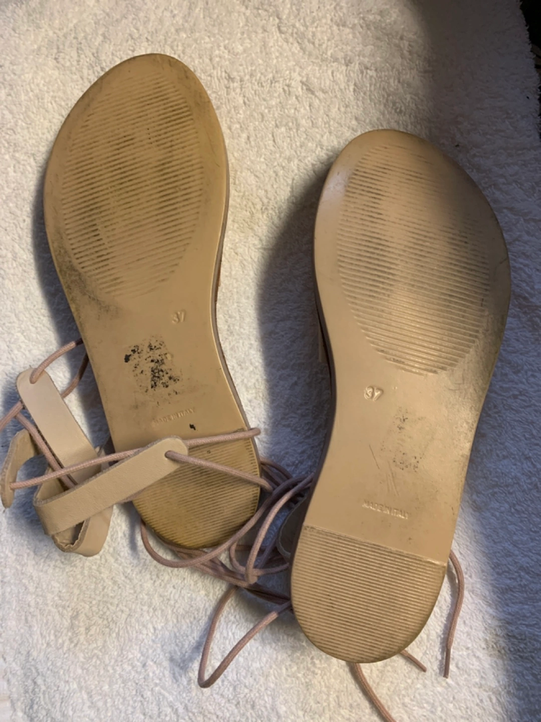 Beige leather lace-up sandals with metal accents. Made in Italy.