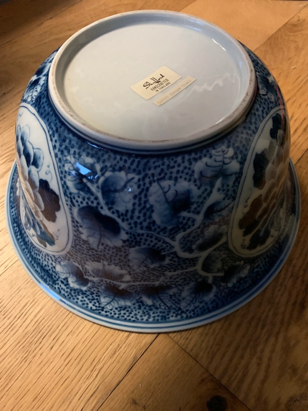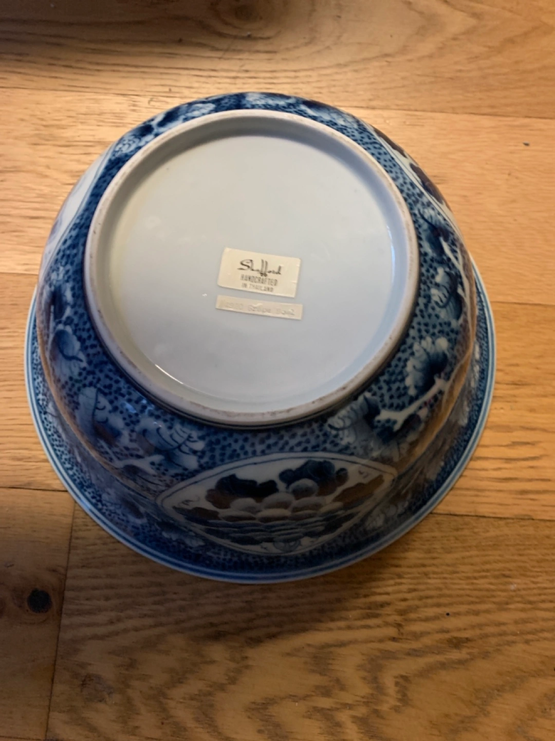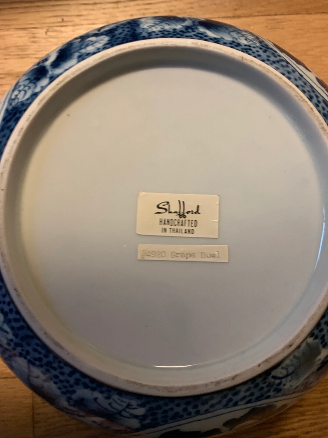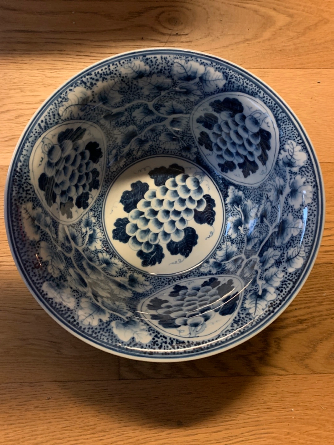 Blue and white porcelain bowl with grape design. Handcrafted in Thailand.